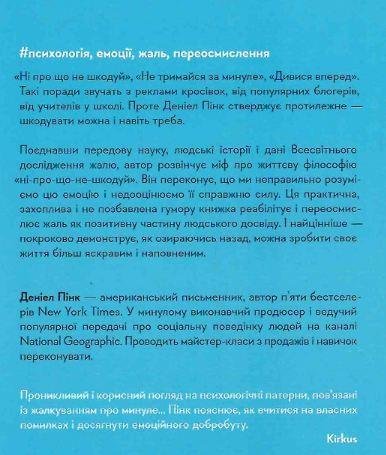 Всі ми про щось шкодуємо. Але це не погано чи добре. Це абсолютно нормальна частина людського буття. Та розуміння того, як працює шкода, може допомогти нам приймати найкращі рішення, наповнитися енергією та додати своєму життю глибокого сенсу. Опираючись на дослідження у галузі соціальної психології, неврології та біології, Денієл Пінк доводитиме, що неможливо ні про що не шкодувати. У книжці він використовує найбільшу статистичну вибірку ставлення американців до жалю, яку коли-небудь проводили, а також власне Всесвітнє дослідження жалю, в якому взяло участь 15 000 людей у 105 країнах. Наповнена справжніми історіями людей, структурована і доступно написана, книжка «Сила жалю» змусить вас подивитися на жаль як на щось, що не просто додає нам людяності, а й робить кращими. Та найголовніше — показує, як, оглядаючись назад, ми можемо рухатися вперед.