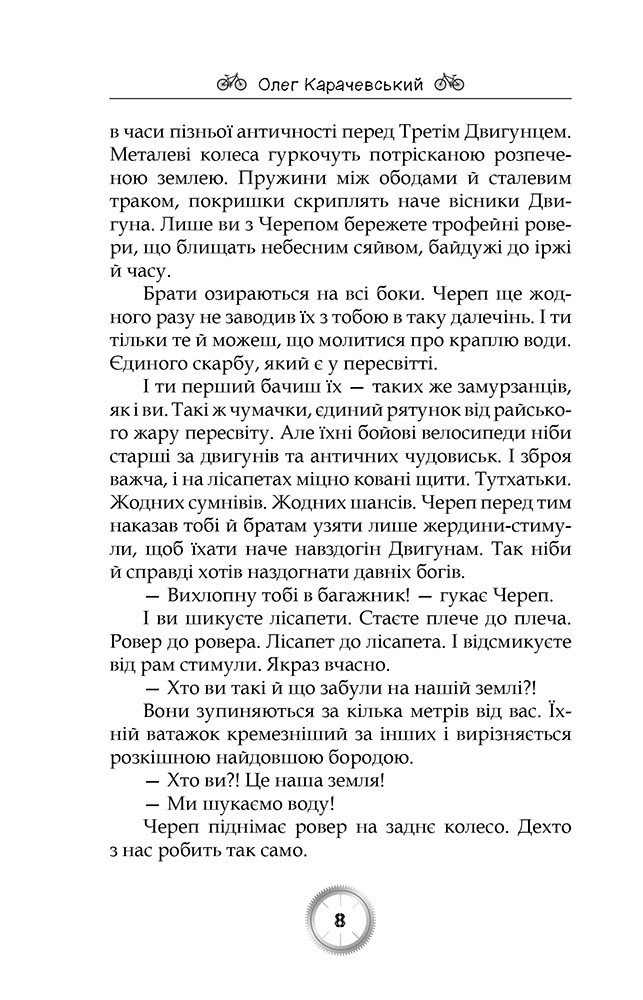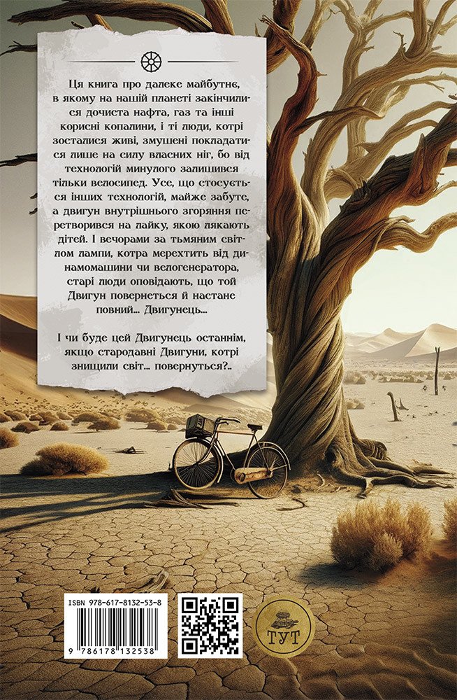 Ця книга про далеке маї?бутнє, в якому на наші? планети закінчилися дочиста нефть, газ та інші корисні іскопалини, і ті люди, які залишилися живі, змушені покладатися лише на силу власних ног, бо від технології? минулого залишився лише велосипед. Все, що стосується інших технологій, можна забути, а двигун внутрішнього згоряння перетворився на лайку, якою лякають діти. І вечорами за тьмяним світлом лампи, яка мерехтить від динамомашини чи велогенератора, старі люди розповідають, що тої? Двигун повернеться та? настане повні?… Двигунець…І чи буде цеї? Двигунець останнім, якщо стародавні Двигуни, котрі знищили світ… повернутись?..