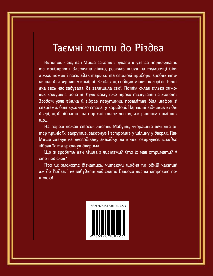 Адвент-календар на 26 днів перетворює очікування свят на захопливе подорож. Щодня на читачів чекає новий епізод зимової казки про Ведмедика, який готується до Різдва і натрапляє на дивовижні листки, залишені таємничими відправниками. Розкриваючи конверт за конвертом, Мишко відкриває приховані під снігом секрети, несподівані підказки та малі діви, що ведуть його до великого передсвяткового відкриття. Хто надсилає ці листи? Які пригоди чекають далі? Ця історія щодня дарує частинку тепла та чарівності зимових свят.