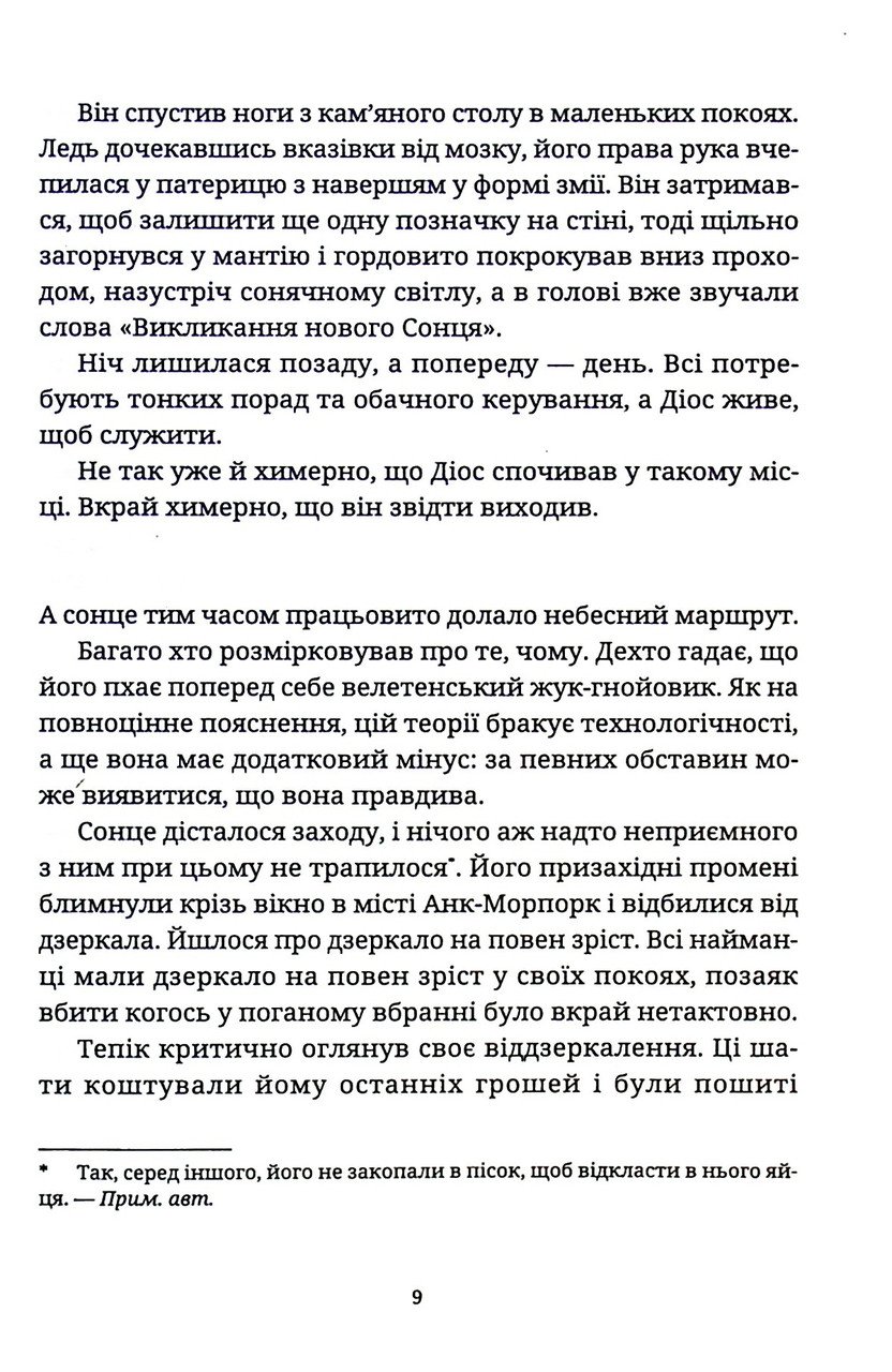Тепік отримав чудову освіту в Анк-Морпоркській Гільдії Найманих Убивць. Він знає, як безшумно підкрастися до жертви і як скласти іспит із пасток. Але він зовсім не готовий до того, що чекає його вдома. А вдома, біля прадавнього царства Джелібейбі, помер фараон. Тепер Тепік повинен зайняти його місце. Замість чорного костюма – золота маска, замість ядів – керування рухом Сонця. Але найбільша проблема – це піраміди. Вони заполонили все царство, висмоктують бюджет і… викривляють годину. Чи зможе наймань убивця “ліквідувати” вікові традиції, врятувати свій народ від схиблених жерців та не збожеволіти від власної божественності?