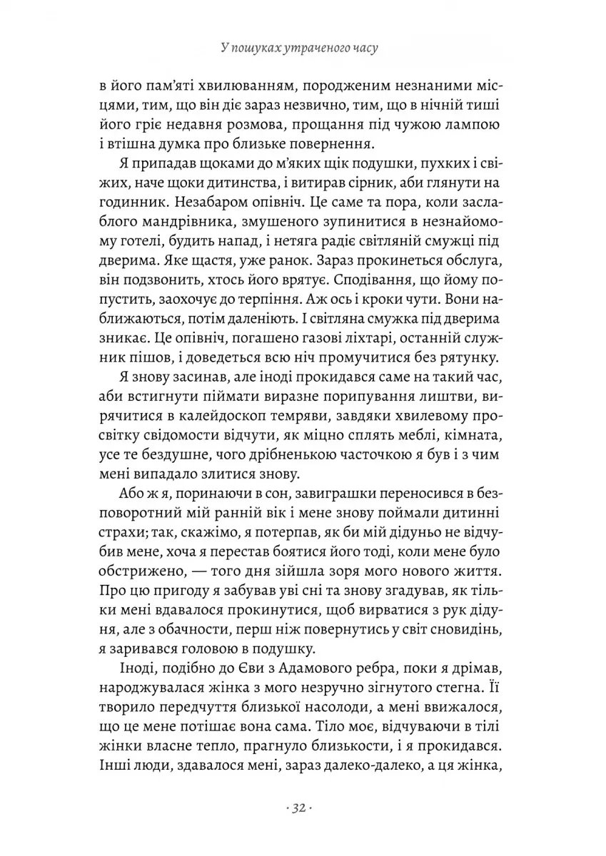 Перший частина знаменитої семитомної епопеї Марселя Пруста «У пошуках втраченої години. На Сваннову сторону», у перекладі одного з найвидатніших українських перекладачів Анатолія Перепаді, є одним із ключових творів сучасної психологічної прози. Роман, написаний ще у 1913 році, починає поетичну, заплутану подорож лабіринтами пам’яті — світом дитячих спогадів, внутрішніх переживань та уяви головного героя — хлопчика Марселя, у якого сплелося так багато автобіографічних рис самого автора. У центрі твору — історія втраченого детства, неможливої любові, сатири вищого світу, що потрапив у ловушку ефемерності моди, а також філософське дослідження мимовільної пам’яті, за міріадами потаємних дверцят якої, кожен переживає власну, щоразу іншу історію. Марсель Пруст створивши не белетризовану хроніку подій власного життя, а деталізований автопортрет внутрішнього світу митця, де звук, колір, смак і навіть запах пробуджують воображення і навічно поєднують текст із серцем читача.