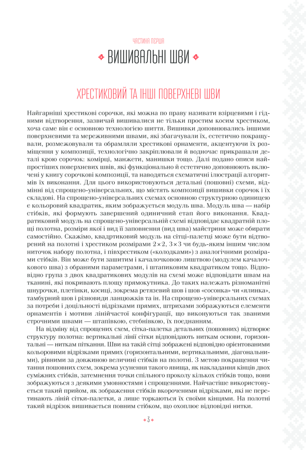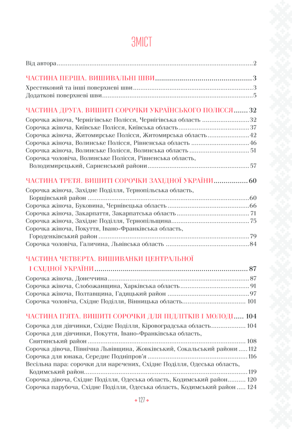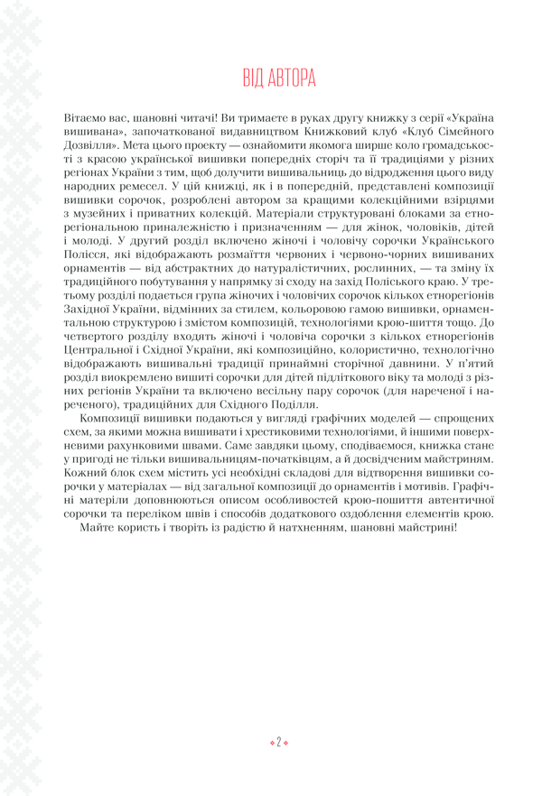Українська вишивка — перлина народної культури, візитівка українців та справжній культурний код, що зберігає в собі традиції наших предків. Чудові орнаменты, прості крої сорочок, гармонійне поєднання кольорів… Вишиванки — це забарвлення українського традиційного одягу. Видання містить схеми моделей жіночих та чоловічих вишиванок. Композиції створені на основі старовинних колекційних поглядів, але з урахуванням сучасних тенденцій вишивання. Поліські, бойківські, галицькі, буковинські, закарпатські, слобожанські, полтавські, подільські орнаменти. Схеми розроблені автором за найкращими колекційними поглядами з музейних та приватних колекцій. У книжці є все, що необхідно для того, щоб створити та власними руками вишити гарний український одяг для дорослих та підлітків: детальні схеми узорів для різних деталей сорочок, вказівки щодо вживання різноманітних поверхневих швів, схеми крою тощо. Відкрийте для себе скарбницю українського вишивального мистецтва!