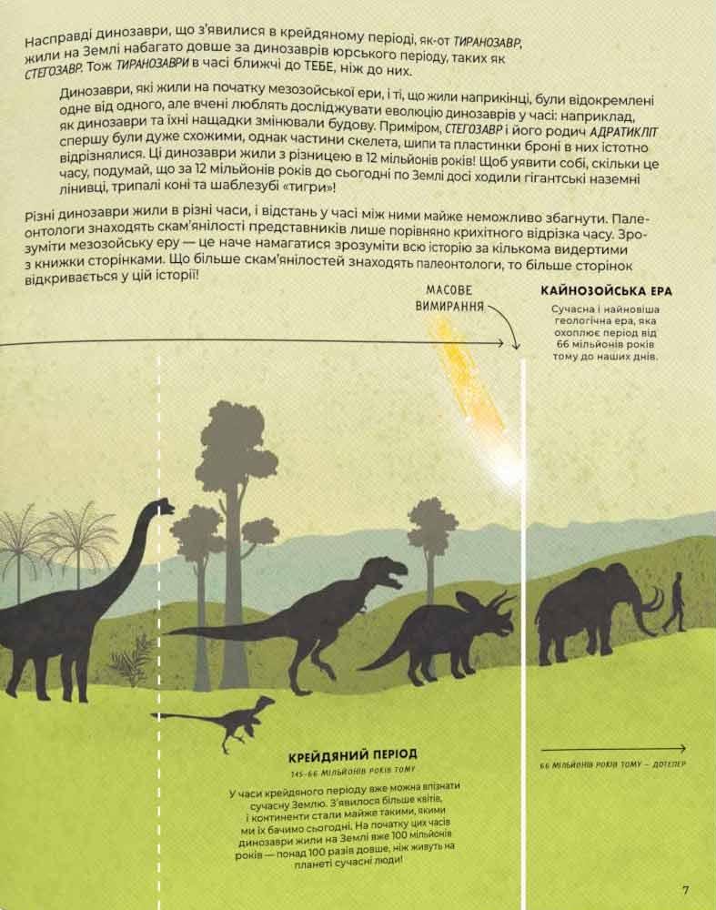 Перед тобою книжка, яка зруйнує застарілий стереотип про динозаврів як про зелені, непримітні та недалекі ящери. Вона покаже їх зовсім іншими — розмаїтими, розумними, вибагливими у поведінці та надзвичайно цікавими з наукового погляду. На сторінках видання на тебе чекають відкриття, які перевертають уявлення про давні години: від нових даних про забарвлення і пір’я до неймовірних гіпотез про зір, слух, соціальність і швидкість цих істот. Прочитавши її, ти отримаєш стільки знань, що впевнено почуватимешся справжнім юним палеонтологом — і в розмовах про динозаврів точно не матимеш собі рівних!