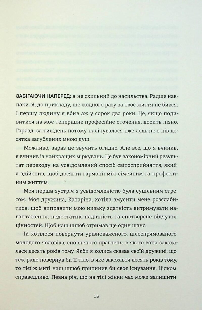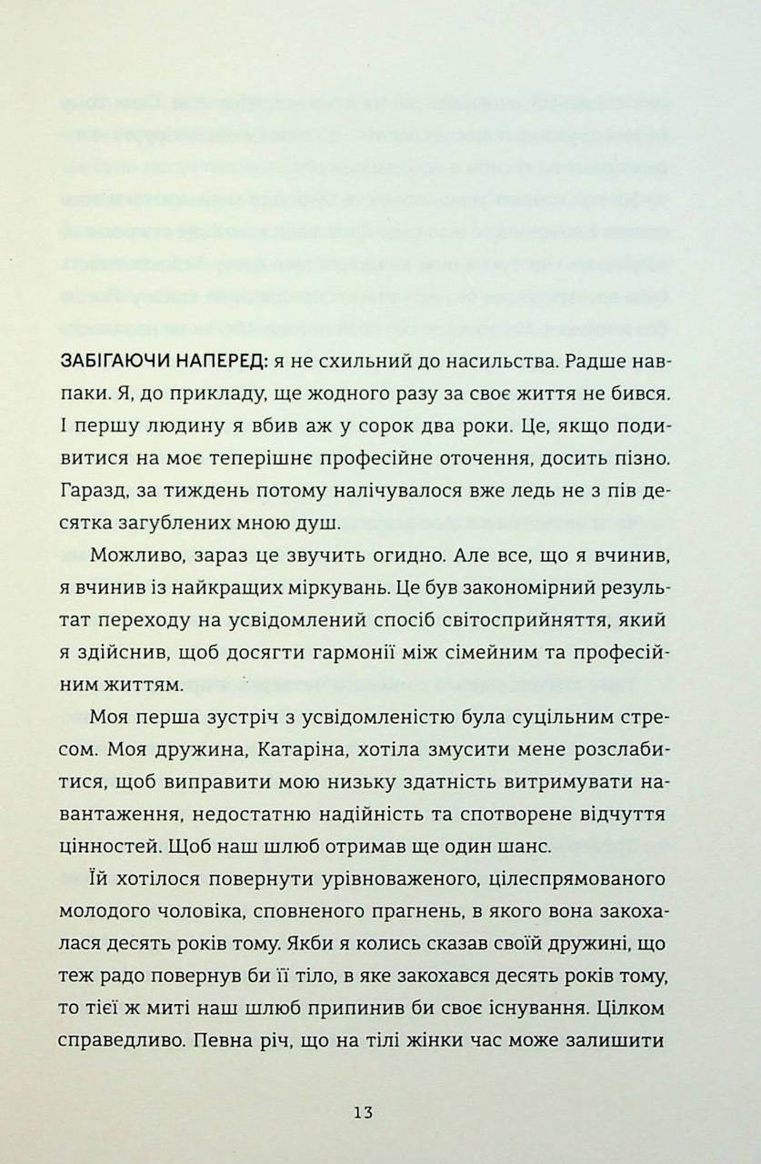 У вас стресова робота, шлюб тріщить по швах, а баланс між роботою та життям — недосяжна мрія? Адвокат Бйорн Дімель вас чудово розуміє. Його життя перетворилося на пекло, поки дружина не поставила ультиматум: або курс з усвідомленості, або розлучення. Бйорн виявився старанним учнем. Він засвоїв головне правило: усувати все, що заважає гармонії. А що робити, якщо головним подразником є твій власний клієнт — жорстокий мафіозі? Бйорн вирішує проблему радикально, але цілком обізнано. Тепер він застосовує дихальні практики, щоб спокійно розчленовувати трупи та керувати злочинним синдикатом. Дебютний роман Карстена Дюсса — це вірна інструкція про те, як покращити якість життя, навіть якщо для цього доведеться когось вбити.