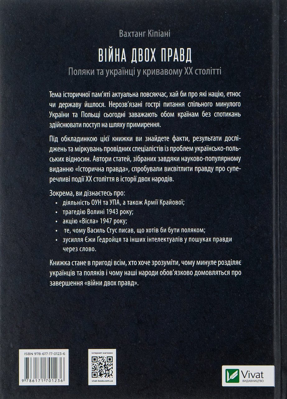 Тема історичної пам’яті актуальна завжди, хай би про які націю, етнос чи державу йшлося. Нерозв’язані гострі питання спільного минулого України та Польщі сьогодні заважають обом країнам без спотикань здійснювати поступ на шляху примирення. Під обкладинкою цієї книжки ви знайдете факти, результати досліджень та міркувань провідних спеціалістів із проблем українсько-польських відносин. Автори статей, зібраних завдяки науково-популярному виданню «Історична правда», спробували висвітлити правду про суперечливі події XX століття в історії двох народів. Зокрема, ви дізнаєтесь про: • діяльність ОУН та УПА, а також Армію Крайову; • трагедію Волині 1943 року; • акцію «Вісла» 1947 року; • те, чому Василь Стус писав, що хотів би бути поляком; • зусилля Єжи Ґедройця та інших інтелектуалів у пошуках правди через слово. Книга стане в пригоді всім, хто хоче зрозуміти, чому минуле розділяє українців та поляків і чому наші народи обов’язково домовлятися про завершення війни двох правд.