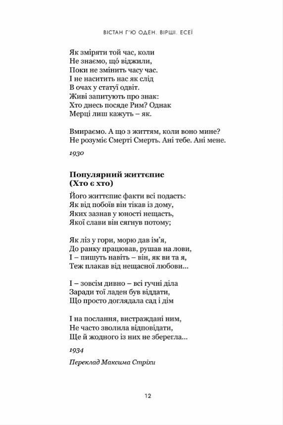 Вістан Г’ю Оден (1907–1973) вже у 1930-х роках, на самому початку творчого шляху, отримав визнання як чільна поетична фігура свого покоління. Сьогодні можна з певністю сказати більше: він – один з найблискучіших поетів ХХ століття, хто писав англійською мовою. Його ім’я ставляти в один ряд з такими великими іменами, як Вільям Батлер Єйтс і Томас Стернс Еліот, однак, на відміну від останніх, Одена українською досі перекладали незаслужено мало. Тож ця збірка віршів та єсеїв стала спробою хоч почасти заповнити чималу і таки прикру перекладну лакуну.
