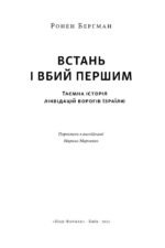 У цій захоплюючій книжці розкриваються секретні місії з ліквідацій ворогів Ізраїлю. Від лідерів «Хамасу» та «Хезболлі» до стратега Організації визволення Палестині, від сирійського генерала до канадського інженера — зібрана тут історія численних цільових вбивств доводити: вороги Ізраїлю можуть забути про спокій. І не важливо, де вони ховаються: «Шин-Бет», «Моссад», ЦАХАЛ та інші сили вистежують і ліквідують їх у Бейруті, Дамаську, Тегерані, Дубаї, Римі, Парижі чи Лондоні. Через успіхи та скандальні невдачі, крізь моральні дилеми, що стоять перед державою в умовах постійної загрози, книжка пояснює філософію «вбив першим», що стала важливою складовою державної політики Ізраїлю. Ронен Берґман зумів взяти інтерв’ю та отримати свідчення прем’єр-міністрів та багатьох інших впливових членів уряду, військових та розвідувальних служб країни. Іронія в тому, що всемогутній «Моссад» доклав чимало зусиль до того, щоб ця книжка не з’явилася на світ. На щастя, саме ця операція «Моссаду» виявилася невдалою. Книга все ж таки вийшла, і в ній цікаво все, включно з примітками.