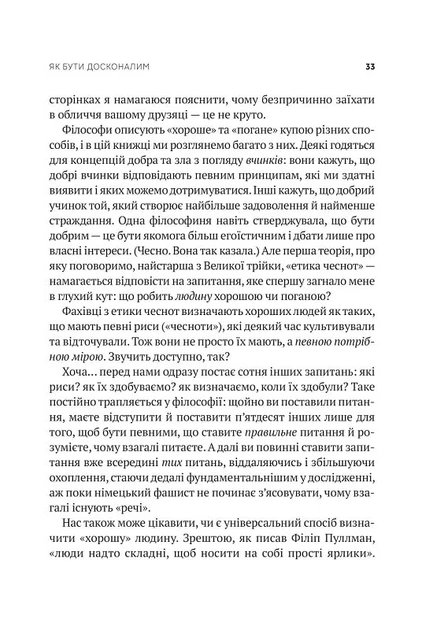 «Етика? Пахне чимось нудним… Зараз повчать, як жити», — можливо, скажете ви. Але ця книжка не така! Її автор не зарозумілий професор і не високочолий інтелектуал, а просто хлопець, охочий розібратися, чи все гаразд із його етичним життям, чи може він стати кращим людиною та як саме. Майкл Шур починає з дуже конкретних і легких запитань на кшталт: «Чи можна бити друга в обличчя?», «Чи варто збрехати подрузі та похвалити її жахливу блузку?», «Повертати продуктову візку з автостоянки до супермаркету?». Продираючись крізь хитросплетіння уявних етичних експериментів та проблемних ситуацій із власної життя, автор підіймається до щораз складніших та контроверсійних тем, які становлять етичний фон наших днів. Ця книжка буде цікава всім поціновувачам етики, практичної філософії, морального самовдосконалення, сучасних етичних дискусій, шанувальникам телевізійної творчості Майкла Шура, а також широкому колу читачів.