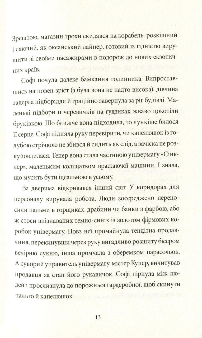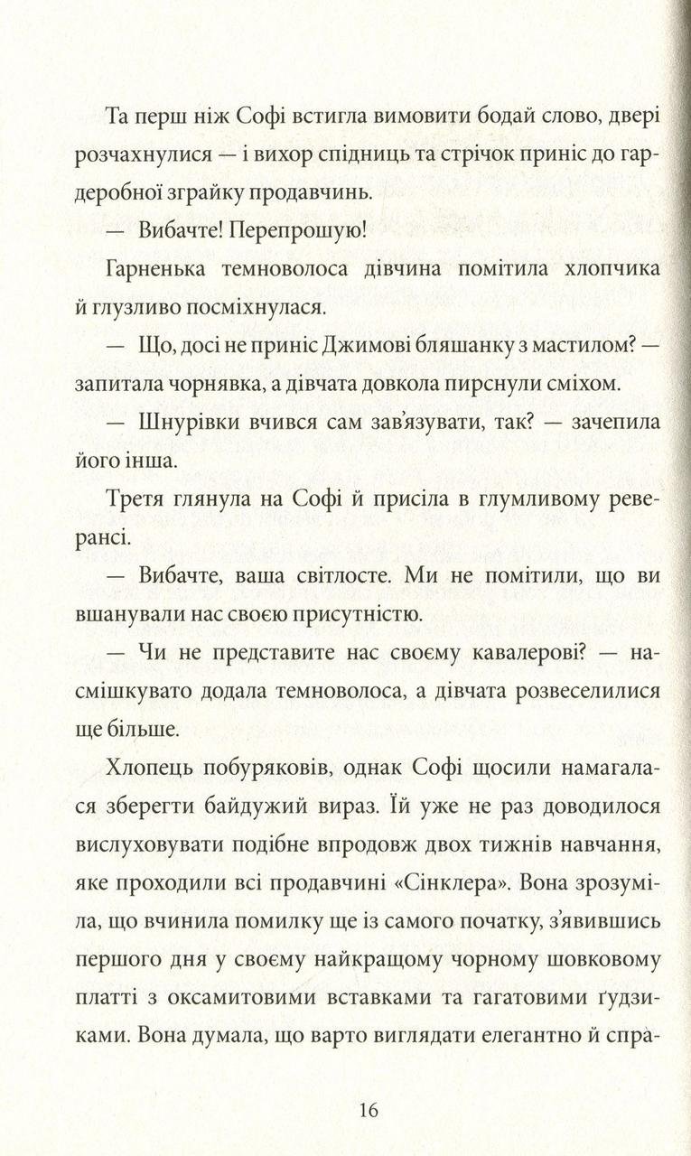 На початку ХХ століття в окутаному туманами Лондоні стається неабияка подія: відкривається величезний універсальний магазин багатія Едварда Сінклера. Ще до відкриття він опиняється в центрі догадок, чуйної та підвищеної уваги. Бо такої розкоші й різноманітності товарів, здається, Лондон досі не бачив. У цей час юна Софі Тейлор, дівчина із колись багатої батьківщини, а тепер кругла сирота, змушена шукати роботу. Чи варто описувати її радість, коли вона проходитиме конкурс на посаду продавчині? Та дівчині доведеться позмагатися з неабиякими труднощами. І насмішки й глузування товаришів по роботі тут виявляються не найстрашнішими. Напередодні відкриття чудового універмагу, звідти викрадають унікальну колекцію коштовностей, яку власник збирався продемонструвати на виставці з особливої для нього нагоди. Окрасою колекції був механічний горобець. Прикрашена чисельними коштовними каменями пташка витиохкувала щоразу іншу мелодію. І ось Софі опиняється під підозрою, бо її того злощасного вечора бачили в залі з дратівностями. Ба більше, поруч із розбитою вітриною находять шпильку для волосся, яка належить дівчині. Тепер завдання Софі та її нових друзів – знайте справжнього злодійника…