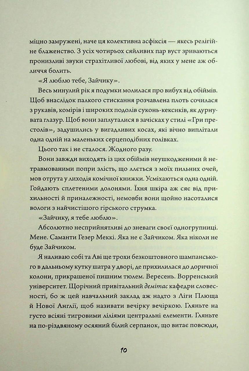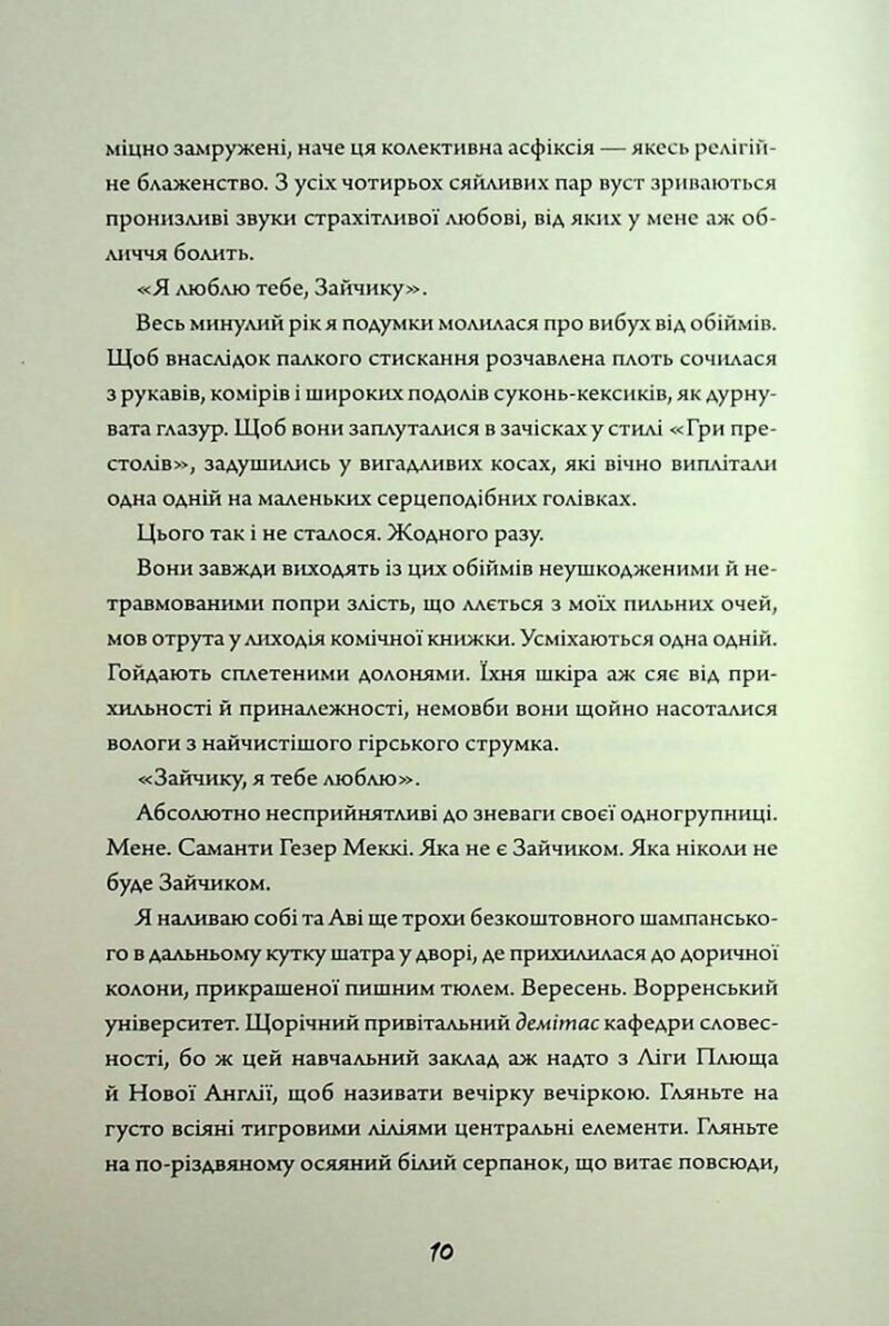 «Зайчики» Моні Авад — це провокаційний, химерний та похмурий психологічний трилер, який вивертає навиворіт поняття жіночої дружби та творчих амбіцій. Саманта, яка звикла триматися осторонь і спостерігати за своєю групою з презирством, раптово опиняється всередині закритого кола «Зайчиків». Те, що спочатку здавалося порожнім ритуалом багатих дівчат, виявляється кривавою та сюрреалістичною магією, де межа між написаним словом та живою плоттю зникає без вороття. Роман майстерно досліджує тему ізоляції та непереборного бажання належати до групи, навіть якщо ця група вимагає від тебе втрати власного «я». Саманта занурюється у світ, де рожевий гламур та солодкі слова сховують монструозні експерименти. Це історія про те, на що готова піти письменниця заради натхнення і як далеко може зайти творча уява, якщо вона підживлюється темними обрядами та колективним божевіллям.