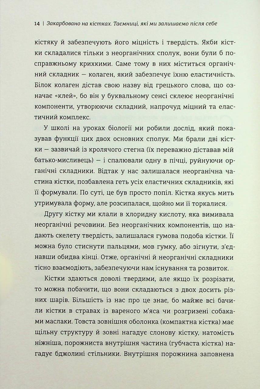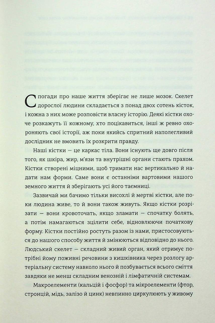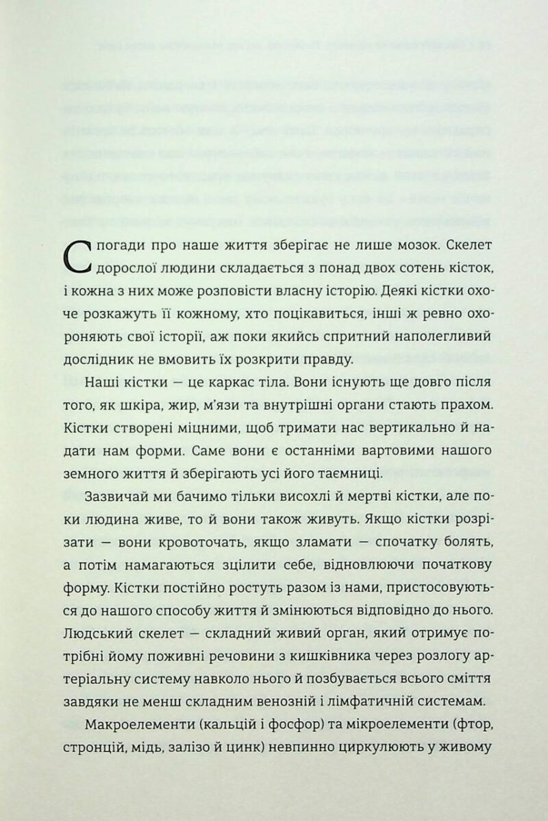 Кістки — це найнадійніші свідки. Вони не можуть збрехати, забути чи змінити свідчення. Усе ваше життя — від улюбленої їжі до давніх травм — записане на вашому скелеті, мов на жорсткому диску, що здатний пережити століття. Судно-медичний антрополог – це детектив, який зламує цей код. Ця книга — захоплива подорож у світ, де наука зустрічається з історією. Автор навчить вас бачити невидимі сліди та читати повідомлення, які терпляче чекали свого часу в тиші могил, щоби нарешті розкрити таємниці життя і смерті.