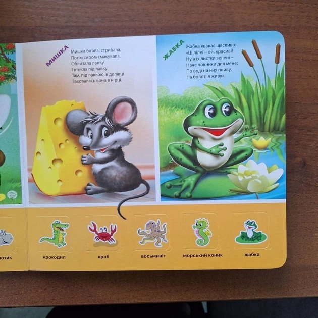 Маленькі діти люблять досліджувати довкілля, відчиняти різні дверцята та шухляди, відкривати для себе щось нове. Тому ця картонка має всі шанси дуже сподобатися малюкам. Сучасні кумедні ілюстрації додають старим казкам свіжості та актуальності. Аж 50 прихованих віконець із несподіванками, яскраві малюнки, цікаві сюжети, підписи українською мовою до всіх об’єктів – все це є цією картонною книгою.
