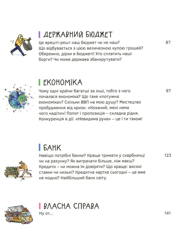 Чи траплялися Вам книги, здатні перевернути свідомість дорослому і навчити дитину, ну скажімо, від 9ти років тому, чого не навчають і в одинадцятому класі? І не просто навчити, а пояснити, так, що ця інформація стане невід’ємною частиною свідомості і буде злижити протягом усього життя! Такі книги існують, а ця фантастична економіка – одна з них. Про що мова? – Звідки беруться гроші і чому їх завжди мало? – Чому деякі люди заробляють більше, а інші – менше? – Для чого потрібний бюджет? Дитина дізнається про рівновагу сімейного та особистого бюджету: про доходи та видатки, а також про можливий дефіцит. – Навіщо нам потрібні налоги і чому ми повинні їх платити? А як там на чорному ринку все влаштовано? – Чому економіка країни зростає, чи ні? Чи може країна стати банкрутом? – Чому в різних країнах на однакову суму грошей можна купити різну кількість Біг Маків? – Що робити, коли гаманець порожній? Може трохи роздрукувати грошей, це ж так просто… – Чи дійсно мати власну фірму це весело? Про банки, кредити, фінансові операції, піт, пропозиції, валюту, обмеження споживання та навіть монети з дірочками – про все це, та про безліч інших важливих промов та явищ весело та доступно розповість ця книга.
