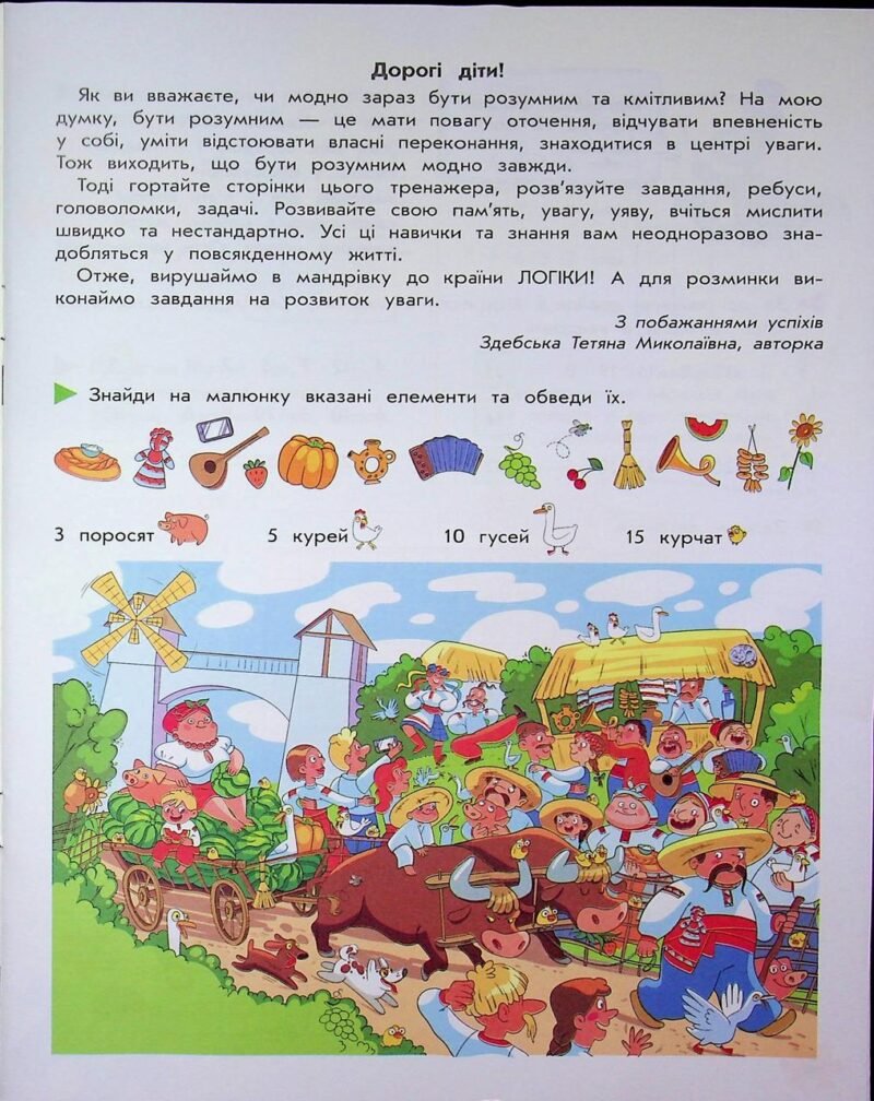Тренажер «Логіка та увага» — це інноваційне видання, розроблене для всебічного розвитку інтелектуальних здібностей школяра. Посібник пропонує системний підхід до навчання, де дитина опановує мистецтво логічного мислення та аргументації. Через послідовне виконання вправ учні привчаються до глибокого аналізу завдань, що дозволяє їм не просто вгадувати відповіді, а приймати раціональні рішення та чітко їх обґрунтовувати. Особливістю цього тренажера є використання передових освітніх методик, зокрема методики Єдигея для роботи з деформованими текстами. Такий підхід стимулює гнучкість розуму та швидкість сприйняття інформації. Розгадування ребусів, анаграм, криптограм та пошук прихованих закономірностей перетворюють інтелектуальну працю на динамічну гру, яка водночас тренує концентрацію уваги та обсяг пам’яті. Крім математичної логіки, значна увага приділяється лінгвістичному розвитку. Виконуючи мовні завдання, дитина не лише збагачує свій словарний запас, а й вчиться відчувати структуру мови. Усі упражнення побудовані так, щоб отримані навички були придатні для використання в реальних життєвих ситуаціях. У підсумку робота з тренажером формує впевнену особистість, здатну критично мислити та успішно долати нестандартні визови.
