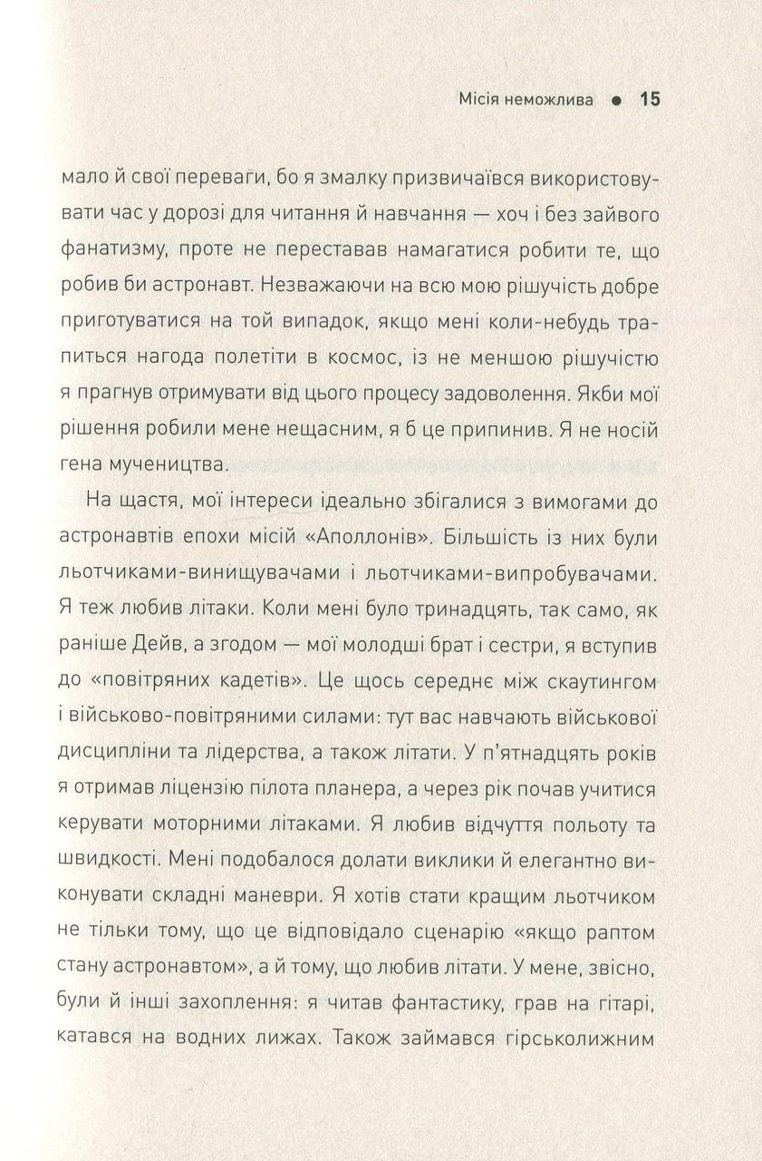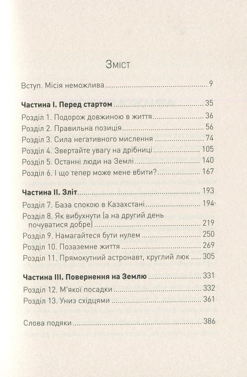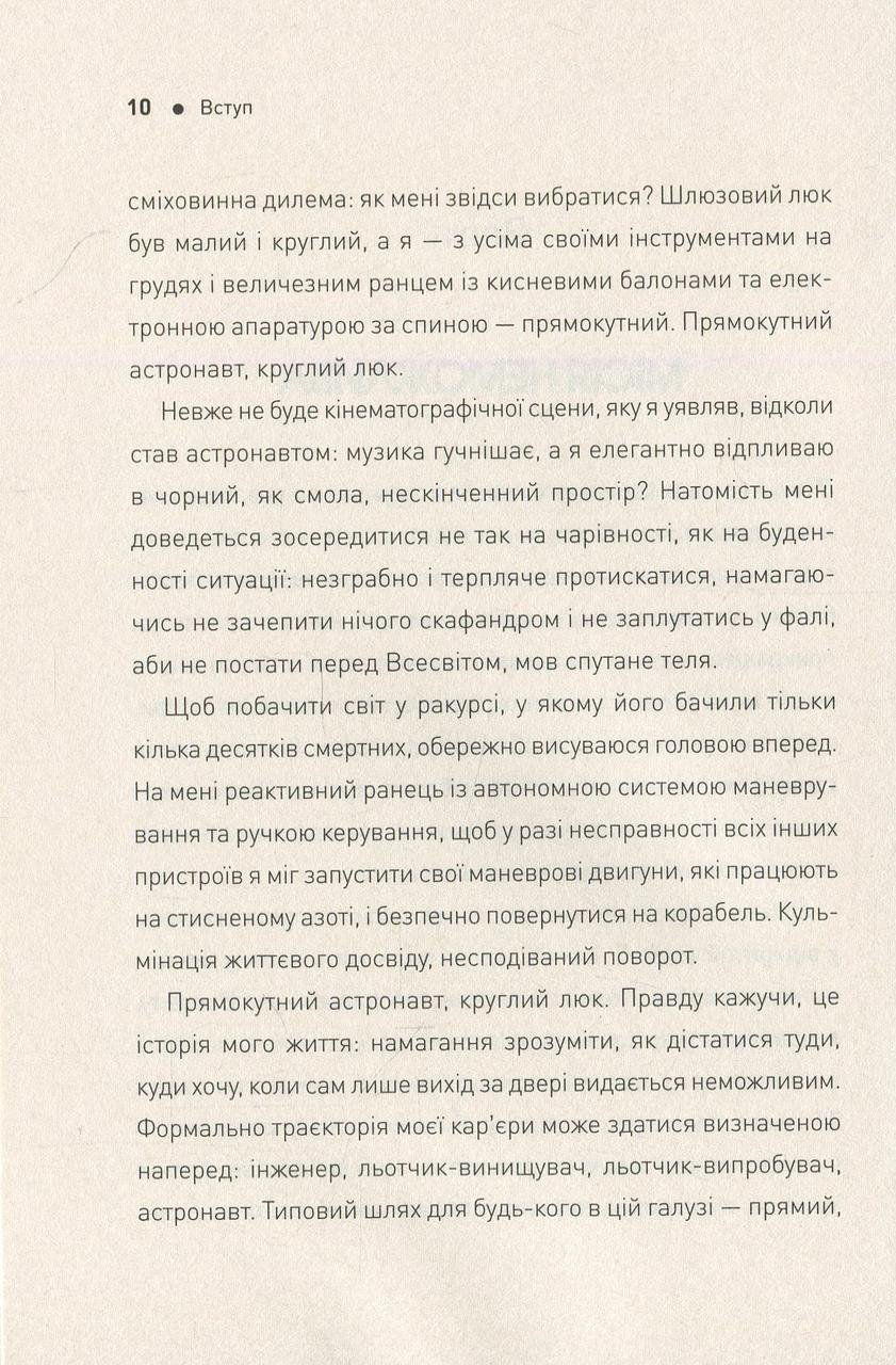 Говорять, що згори завжди видніше. Перш ніж давати поради щодо життя на Землі, канадський астронавт Кріс Гедфілд тричі побував у космосі, провівши там загалом майже 4000 годин. За цю годину він встиг взяти участь у спорудженні МКС, ледь не втративши зір і став справжньою зіркою YouTube, виконавши у стані невагомості пісню Девіда Бові «Space Oddity». У посібнику астронавт розповідає про свій шлях до зірок: від дитячої мрії, що здавалася нездійсненною, до шаленого адреналіну, який він відчув за тисячі кілометрів від рідної планети. Звісно, більшості з нас навряд чи доведеться лагодити космічного робота, керувати шатлом або виходити у відкритий космос, як Крісу Гедфілду. Але його щирі, дотепні та проникливі історії змусять інакше подивитись на власну життя, на його цінності, успіхи та невдачі.