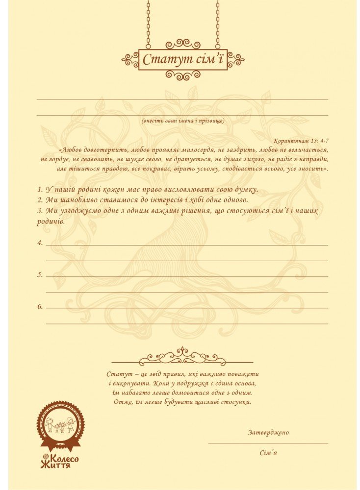 Дайте собі чесну відповідь – вас повністю задовольняють закони та правила, що діють у вашій батьківщині? А чи є те, що викликає у вас незадоволення чи заважає на 100% насолоджуватися сімейною життям? Ви можете сказати: “Так, це дрібниці”. Звичайно, швидше за все, це дрібниці. Але рано чи пізно з будь-якої дрібниці може виникнути великий скандал. Вам це треба? Щоб уникнути можливих скандалів у майбутньому, важливо сформулювати чіткі правила та цінності сім’ї. Психологи кажуть, що це один із кращих прийомів формування позитивних відносин у будь-якому колективі (сім’я, це теж колектив). Але лише сформулювати недостатньо. Їх потрібно записати та затвердити. “Неформальні сімейні закони для щасливої життя” – унікальний інструмент створення в батьківщині атмосфери довіри, уваження та любові один до одного. Унікальність комплекту Інструмент для формування згуртованості сім’ї, уваження один до одного та до потреб шкірного. Комплект розроблень з урахуванням провідних практик сімейних психологів. Враховано всі важливі аспекти сімейної життя: цінності, цілі, розподіл прав та обов’язків, важливі дати, правила проведення переговорів, традиції тощо. Практика для розвитку навички розмовляти один з одним без криків, образ і зварювань. У чому комплект буде корисним для вас Ви створите основу для розвитку по-справжньому щасливої батьківщини. Ви навчитеся поважати потреби та бажання один одного. Ви створите правила, які допоможуть рівномірно розподілити обов’язки кожного члена сім’ї. Ви зможете аргументовано та спокійно вирішувати спірні питання. Ви весело та цікаво проведете годину, обговорюючи та заповнюючи шкірну сторінку комплекту.