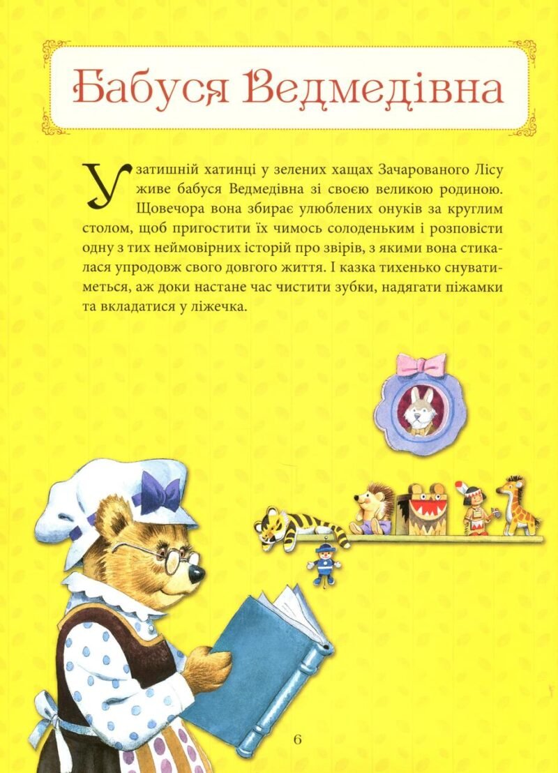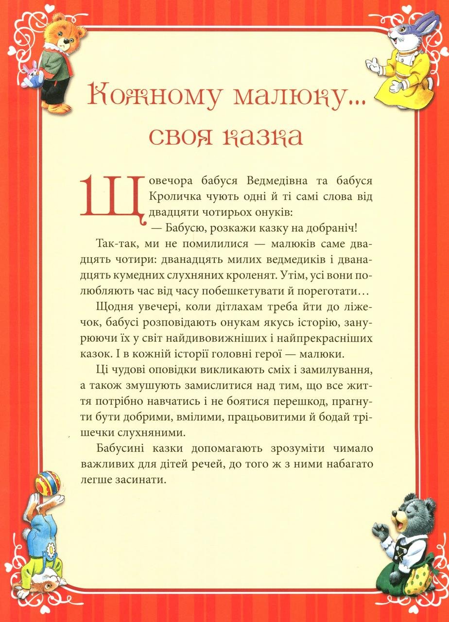 Щовечора бабуся-ведмедиця та бабуся-кролиця розповідають онукам цікаві казки про інших тварин. Ці оповідки викликають сміх і замилування, а також змушують замислитися над тим, що всю життя потрібно навчатися і не боятися перешкод, прагнути бути добрими, вмілими, працьовитими і хоч трохи слухняними. Послухайте й ви їх розповіді: умощуйтеся зручно між ведмежат і кролят, нашорошуйте вушка і готуйтеся засинати під звуки вечірньої казочки.