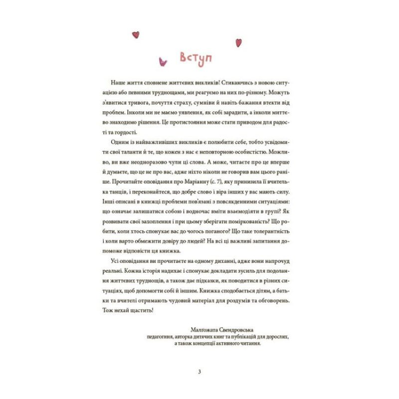 Дванадцять авторів написало дванадцять історій про життєві виклики. Зображаючи яскравих персонажів та їх повсякденні переживання, вони намагалися відповісти на питання, як навчитися подолати труднощі. До книжки увійшли оповідання про самооцінку, агресію, толерантність, опасність, яка чатує на дітей в інтернеті, зосередженість, захоплення, зловживання мобільними пристроями, суперництво, маніпуляцію, надчутливість, соціальний тиск і сором’язливість. Ця книжка заохочуватиме дітей розповідати про ситуації, які могли з ними трапитися, та допоможе у процесі дорослішання навчитися справлятися з життєвими викликами.
