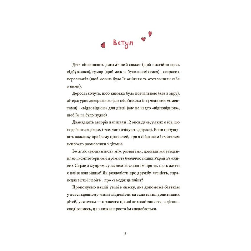 Дванадцять авторів написали 12 оповідань, які мають все, що подобається дітям, і все, на що очікують дорослі. Історії порушують дуже важливу проблему цінностей, про які батькам та вчителям непросто розмовляти з дітьми. Завдяки кумедним текстам складні теми стають простими та зрозумілими.