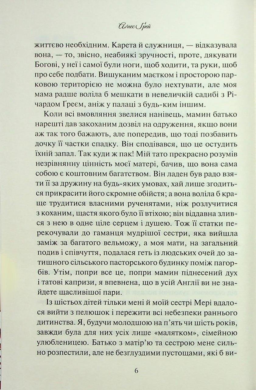 Юна Аґнес Ґрей, донька збіднілого пастора, сповнена ідеалістичних мрій, вирішує допомогти батьківщині та вирушає у великий світ працювати гувернанткою. Проте реальність вікторіанської Англії б’є її навідліг. Замість вихованих учнів вона отримує розбещених, жорстоких дітей, які знущаються з тварин і людей, а замість шанування роботодавців — крижану зневагу. Для багатих Блумфілдів і Мюрреїв вона — лише предмет інтер’єру, обслуга, що не має права на втому чи власну думку. Цей роман, значною мірою автобіографічний, є найчеснішою сповіддю Енн Бронте. Це історія про щоденний подвиг збереження власної гідності у світі, де все вимірюється грошима та титулами. Аґнес веде тиху, але запеклу боротьбу за право залишатися собою, не озлобитися і зберегти чисте серце. І саме ця внутрішня сила притягує до неї містера Вестона — скромного вікарія, який, на відміну від пихатої аристократії, здатний розглянути за сірим платтям гувернантки багату душу. Це роман про кохання без надриву, що базується на повазі, розумінні та спільних цінностях.