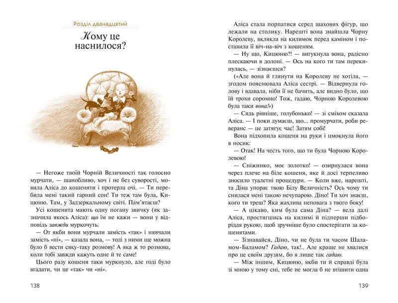Книжки Льюїса Керрола вже багато поколінь дітей та підлітків навчили дуже важливим промовам: не боятися мріяти, завжди йти своїм власним шляхом, ніколи не здаватися, не поступатися будь-яким життєвим труднощам… Вона знала ціну пригодам і фантазіям, тому саме їй відкрився чарівний світ, де все було поставлене вгору дріґом, оживали шахи і карти, великий кіт з широчезною посмішкою з’являвся будь-де буквально з порожнечі, і кожної миті твоє життя залежить лише від того, чи готовий ти безґлузді рішення. А може, це не ми бачимо своє відображення в зеркалі, а воно бачитиме нас? По який бік зеркала ми перебуваємо насправді? І, цікаво, хто кому снитися? Відповіді на ці прості (на перший погляд) питання знає лише Аліса. Ходімо з нею?