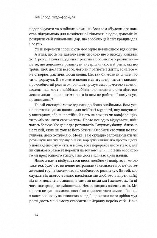 Новинка від автора бестселлера “Чудове ранок”. Ви можете щодня медитувати, читати книжки про особисте розвиток, очищати розум за допомогою ведення щоденника і стати найбільш знаним, впевненим та підготовленим людиною, а потім нічого із цим не робити. Хоча щоденна практика особистого розвитку допоможе розвинути внутрішні якості і рисі, потрібні для досягнення всього, чого ви прагнете в житті, але вона все ж таки не створює фактичні досягнення. Це, так би мовити, лише частина формули. Гел Елрод вважає, що в рецепті успіху має бути два найважливіші інгредієнти: непохитна віра та надзвичайні усилия. Тобто людям найчастіше бракує саме віри у власні сили і вони не докладають необхідних зусиль, щоб отримати бажане. Тож «Чудо-формула» познайомить вас із необхідними інструментами, які допоможуть вам реалізувати потенціал і збудувати краще життя. Ви навчитеся досягати реальних фактичних результатів (дива) знову і знову, а з часом цей процес буде простішим. Книжки «Чудо-формула» та «Чудове ранок» можуть працювати в тандемі, адже «Чудове ранок» допоможе вам досягти ясності розуму, спокою та зосередженості на початку дня.