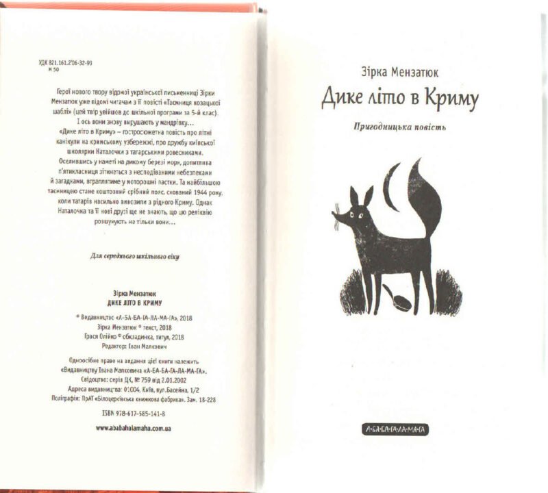 Герої нового твору відомої української писемниці Зірки Мензатюк вже відомі читачам з її повісті «Таємниця козацької шаблі» (цей твір увійшов до шкільної програми за 5-й клас). І ось вони знову вирушають у мандрівку… «Дике літо в Криму» – гостросюжетна повість про літні канікули на кримському узбережжі, про дружбу київської школярки Наталочки з татарськими ровесниками. Оселившись біля намету на дикому березі моря, допитлива п’ятому ятикласниця зіткнеться з несподіваними опасностями та загадками, що втраплятиме у моторошні ловушки. Та найбільшою таємницею стане цінний срібний пояс, схований 1944 року, коли татарів насильно вивозили з рідного Криму. Однак Наталочка та її нові друзі ще не знають, що цю реліквію розшукують не тільки вони…