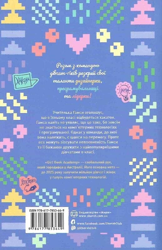 Ще вчора Ганса анічогісінько не розуміла у комп’ютерних технологіях. А вже сьогодні вона має очолити команду, яка візьме участь у шкільному змаганні стартапів — хакатоні. Чотири дівчата повинні розробити власний онлайн-застосунок і представити його журі. На щастя, серед них є крута дизайнерка Ів і хакерки Нікі та Меґґі. Головне, щоб Ганса, яку назначили лідеркою команди, не зіпсувала все через невпевненість та страх бути самою собою. Girl Geek Academy – глобальний рух, який зародився в Австралії. Його основна мета — до 2025 року залучити мільйон дівчат і жінок у галузь комп’ютерних технологій.