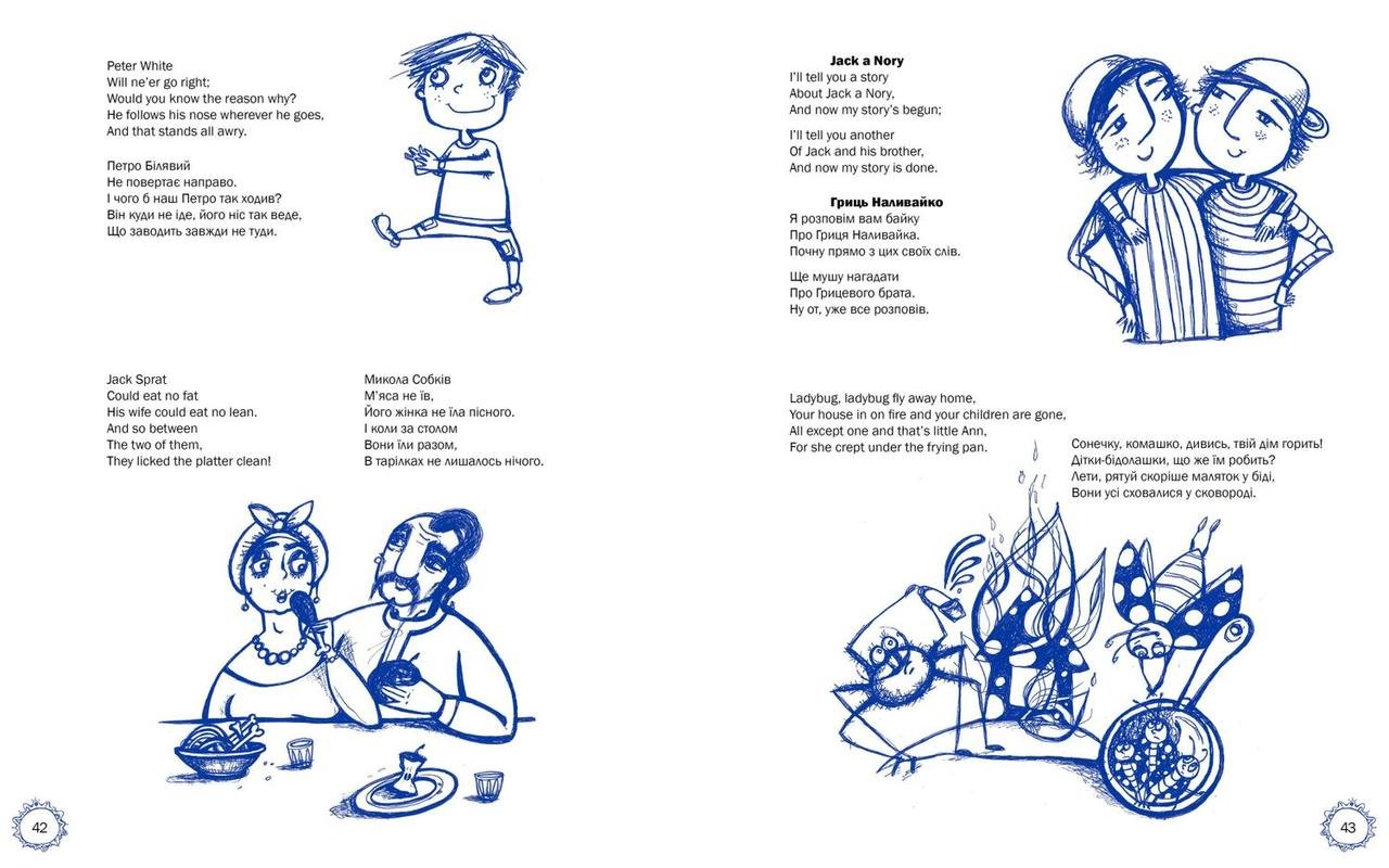 До збірки увійшли оригінали та стилізовані до українських реалій переклади вибраних англійських дитячих віршиків класичного жанру, відомого як “рімі дитячої кімнати” або nursery rhymes. Для кращої передачі трохи архаїчного, народного звучання оригіналів, перекладач часом вживає наголоси та граматичні звороти, характерні для розмовної мови Галичини, а також підбирає українські відповідники для імен, місць назв, страв, професій. До деяких віршиків, відомих ще і як пісні, наприкінці книжки подано ноти мелодій. Сподіваємося, читачам сподобається ця інтерпретація популярних народних англійських текстів сто-п’ятисотлітньої давності.