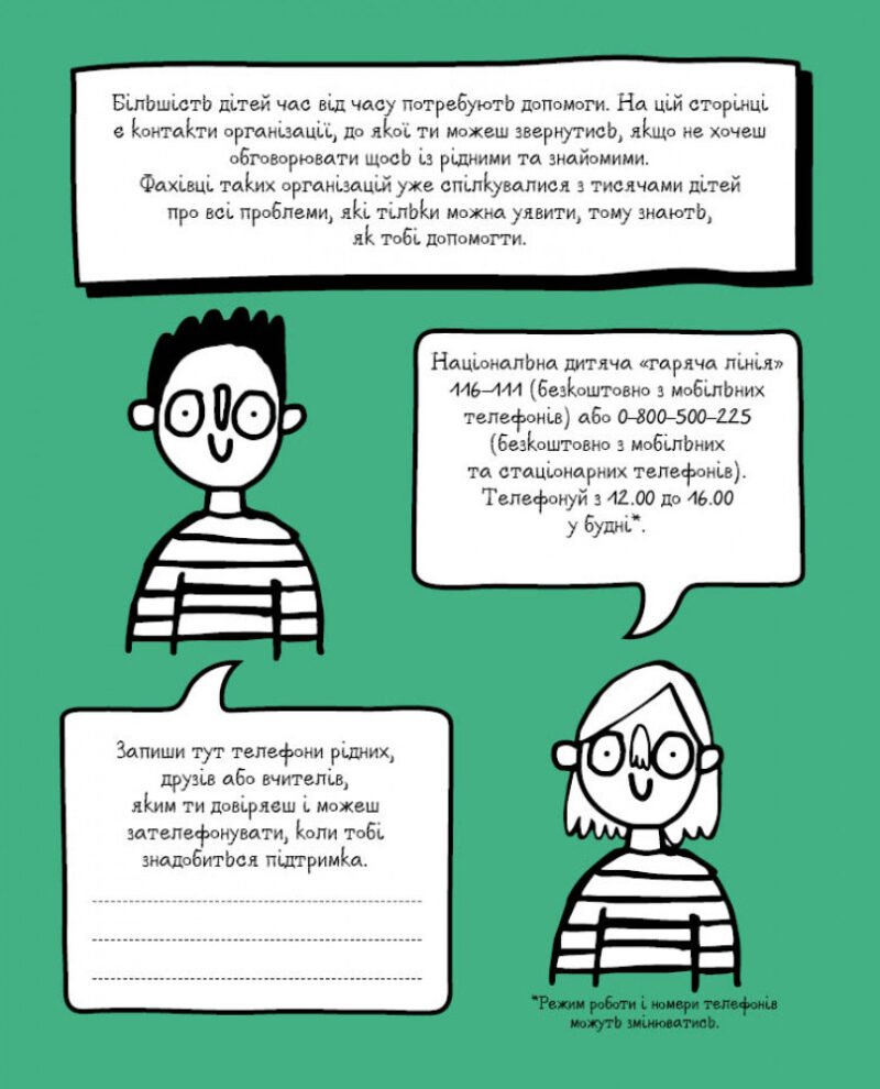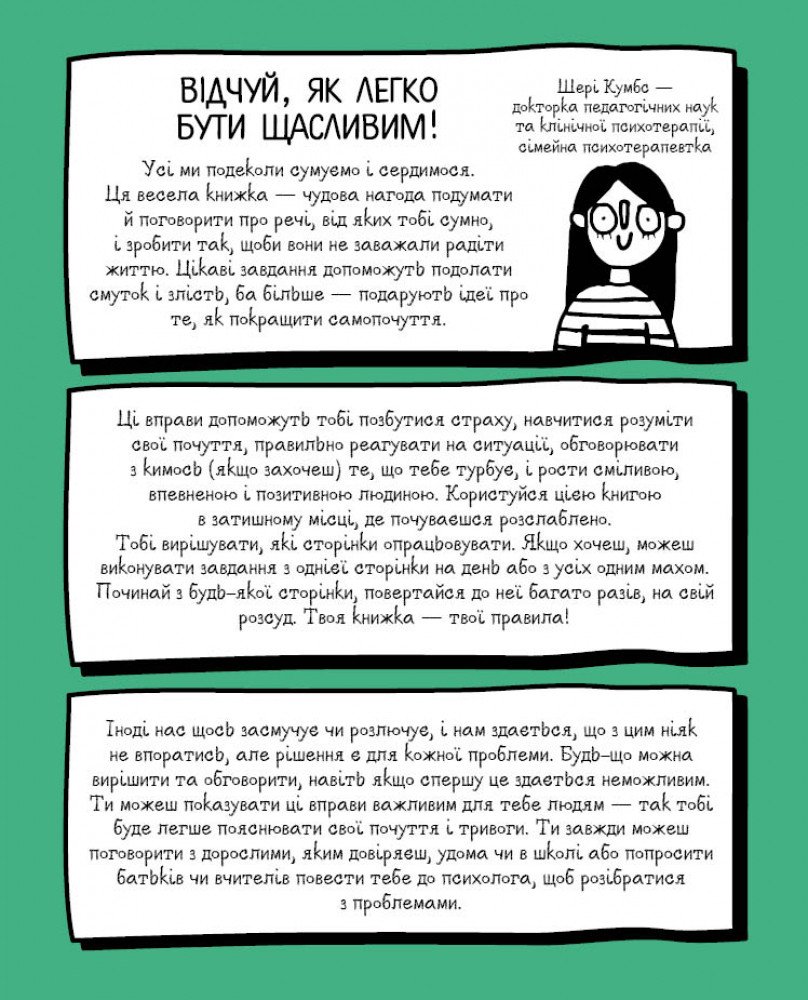 Усі ми іноді сумуємо і сердимося. Ця весела книжка із заняттями — чудова нагода подумати та поговорити про речі, від яких тобі сумно, і зробити так, щоб вони не мешали радіти життю. Цікаві завдання допоможуть подолати смуток і злість, а більше — подарують ідеї про те, як покращити самопочуття. Ці вправи допоможуть тобі позбутися страху, навчитися розуміти свої почуття, правильно реагувати на ситуації, обговорювати з кимось (якщо захочеш) те, що тобі турбує, і рости сміливим, впевненим і позитивним людиною. Користуйся цією книгою в затишному місці, де відчуваєшся спокійно. Тобі вирішувати, які сторінки опрацьовувати. Якщо хочеш, можеш виконувати завдання з однієї сторінки на день або з усіх одним махом. Починай із будь-якої сторінки, повертайся до неї багато разів, на свій розсуд. Твоя книжка – твої правила!