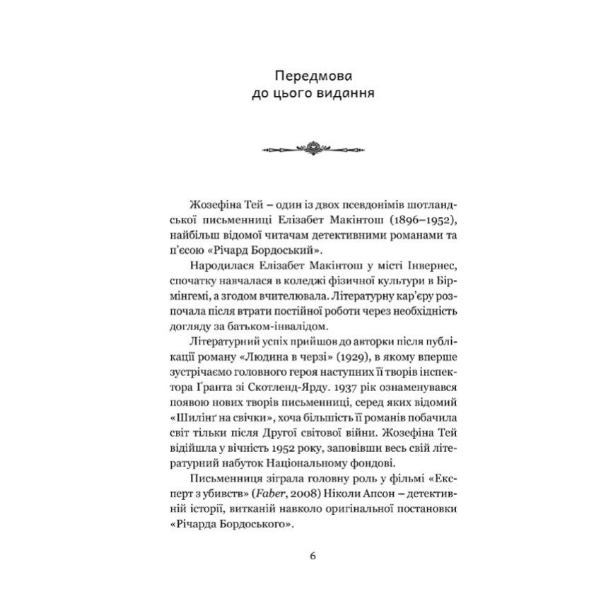 Не секрет, що обличчя людини відображає її характер та поступки. А якщо те, що ви бачите, діаметрально протилежне тому, що про людину говорять? Повірите своїй інтуїції чи поголосу? Герой роману Жозефіни Тей детектив Алан Ґрант тимчасово прикутий до ліжка і знемагає від нудьги. Йому випадково потрапляє до рук зображення людини, яку він посадив би в крісло судді. Прочитавши на звороті, що це – портрет Річарда ІІІ, Ґрант спантеличений. Адже всім зі шкільних років відомо, що цей король убив двох своїх племінників. Не міг же він так помилитися! Алан Ґрант розпочинає розслідування. Його, як детектива, цікавитимуть лише факти. Але свідки суперечити один одному. Історію пишуть переможці, а істина – «дочка часу». Тож хто має рацію: детектив чи безсумнівний авторитет – «святий» Томас Мор?