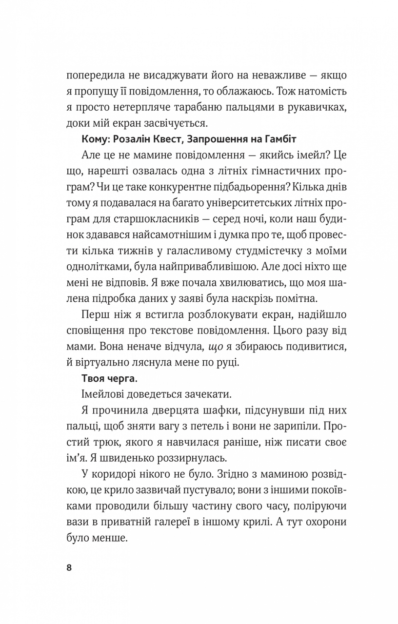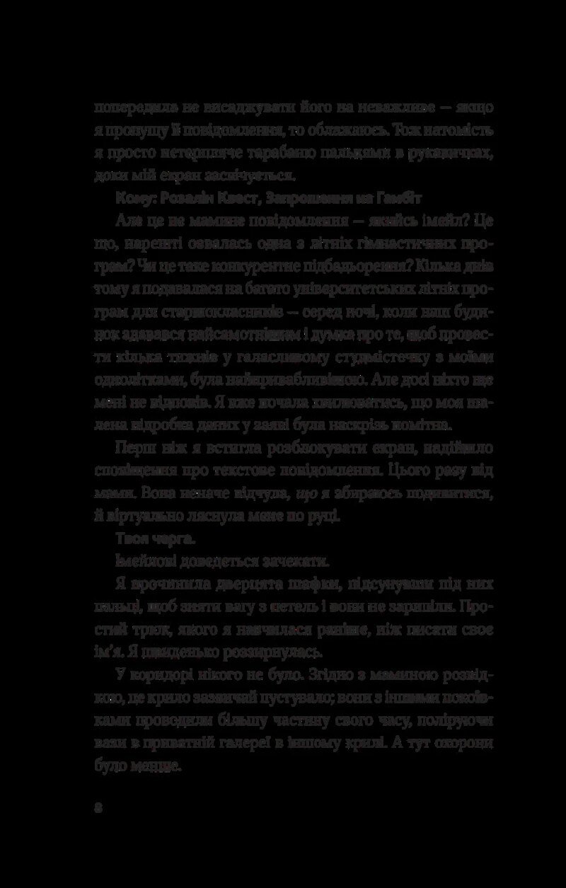 Сімнадцятирічна Розалін Квест виросла серед легенд і тіней — у батьківщині майстрів крадіжок, де довіра існує лише всередині клану. Вона знає, як проникнути в будь-яке сховище, як залишити після себе лише шепіт і слід у темряві. Але, незважаючи на бездоганну репутацію, дівчина мріє про свободу — про життя поза правилами Квестів. Коли її матір зникає за загадкових обставин, Розз має забути про власні бажання. Єдиний шлях урятувати найдорожчу людину — взяти участь у Гамбіті крадіїв, смертельно небезпечному змаганні, де кожен учасник має свою таємницю, а перемога дістається тому, хто готовий ризикнути всім. Серед суперників Розалін — давня ворогиня, яка не пробачає вражень, і хлопець із небезпечною усмішкою, здатний викрасти не лише скарб, а й серце. У грі, де брехня — валюта, а враження означає смерть, Розз доведеться перевірити власні межі, щоб урятувати матір і не втратити собі. Бо у світі злодіїв виграє не найсильніший — а той, хто готовий зробити останній хід.
