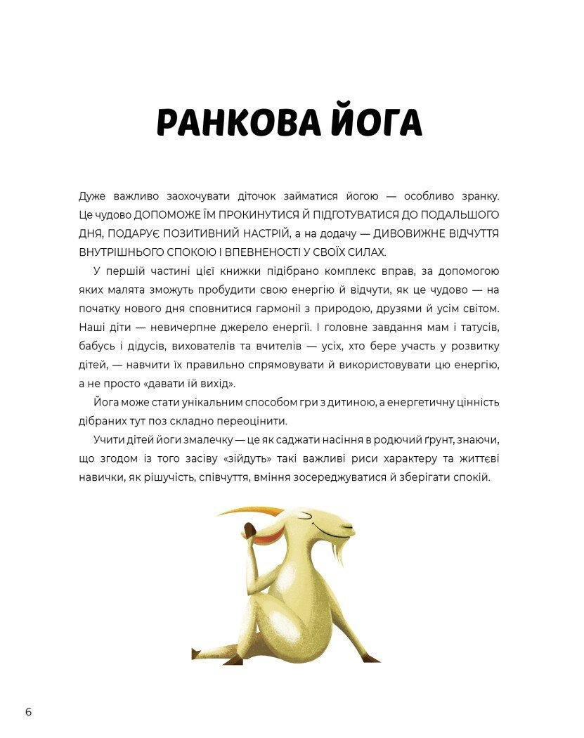 Як навчити дитину керувати своєю енергією? Бути бадьорою вранці і спокійно, без капризів засинати вночі? Пограйте з нею в йогу! Комплекс ранкових i вечiрних вправ мiстити 32 позi, або асані. Завдяки зрозумілій покроковій інструкції їх цікаво і легко виконувати навіть малюкам. Шкіра з асан має свої енергетичні властивості, і якщо дотримуватися правильного порядку, ви неодмінно відчуєте їхню користь.