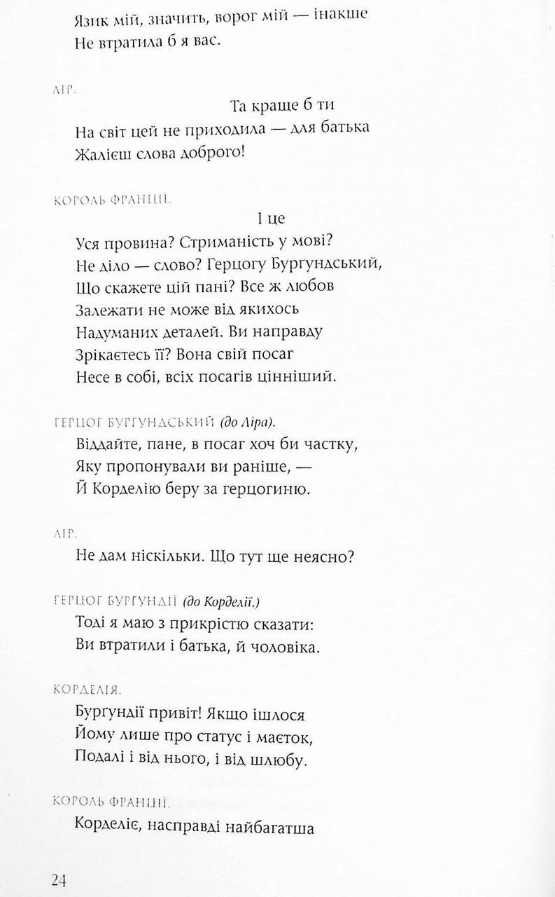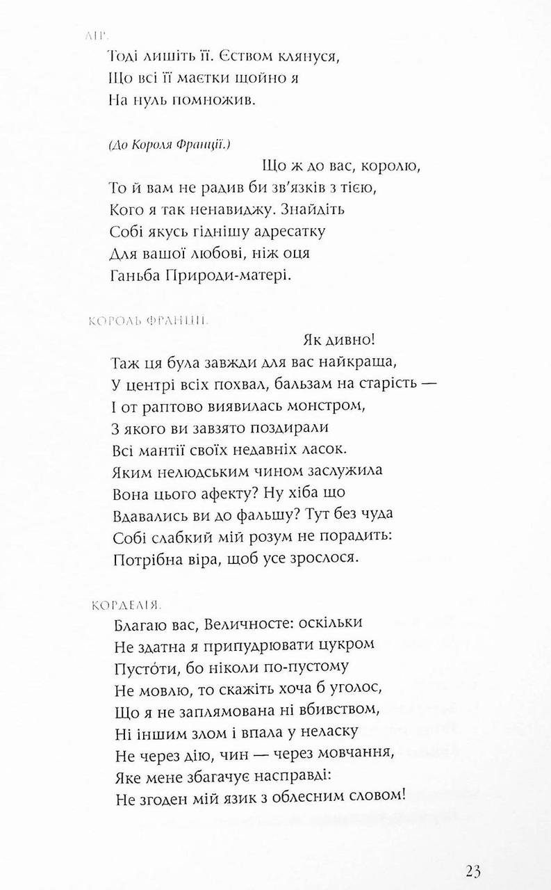 Це перший у третьому тисячолітті український переклад одного з вершинних творів Шекспіра. Сюжет п’єси побудов на історії легендарного короля Ліра, який на схилі життя вирішує відійти від справ і розділити своє королівство між трьома доньками. Для визначення розмірів їх часток він просить кожну з них сказати, як сильно вони його люблять. Дві старші охоче вправляються біля лестощів, а наймолодша — Корделія — відмовляється лестіти, говорячи, що її любов вища за слова. Розгніваний батько зрікається молодшою донькою і проганяє графа Кента, що намагався заступитися за Корделію. Лір поділятиме королівство між старшою і середньою доньками. Невдовзі він із гіркотою усвідомлює їхнє жахливе лицемірство, але це його прозріння надто запізніле… Наше видання підготували два знакові майстри сучасного українського культурного простору — письменник Юрій Андрухович та ілюстратор Владислав Єрко. Їхня версія «Короля Ліра» — це щаслива нагода пережити геніальний твір по-новому, остро відчути його вічну актуальність.