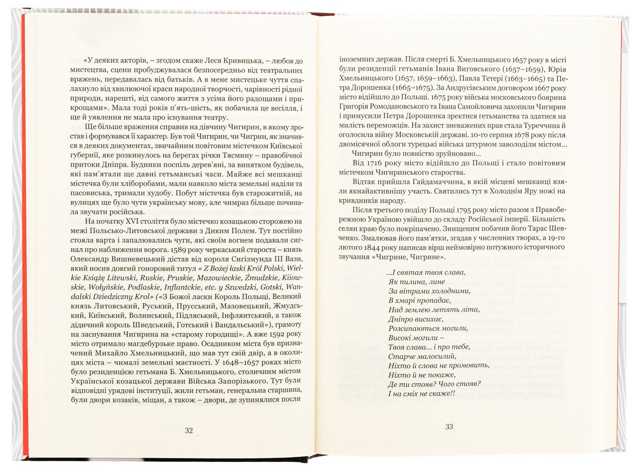 Ця розповідь не лише про життя однієї з найвизначніших українських акторок – Лесі Кривицької з історичного Чигирина, яка з театром Миколи Садовського емігрувала до Західної України, а й про гірку емігрантську частку актора взагалі і частку галицького актора з покоління Івана Рубчака, Йосипа Стадника, Володимир різними окупаційними режимами та бути вірними своєму покликанню. Для широкого кола читачів та всіх, хто цікавиться історією українського театру.