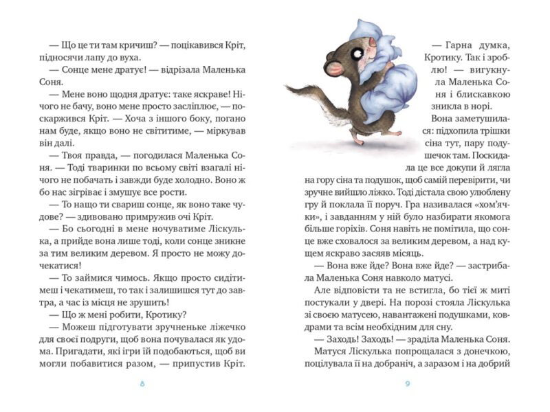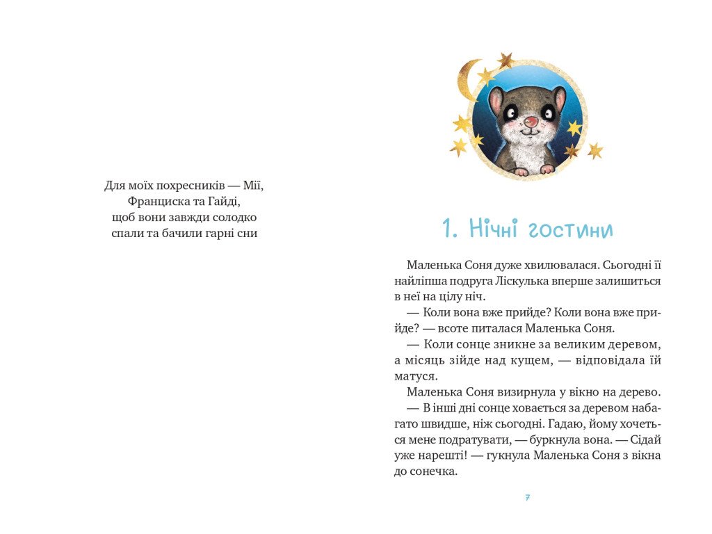 У Маленької Соні велика радість: найліпша подружка, Ліскулька, вперше залишається у неї на ночівлю. Ліскулька не може заснути без казочки, а Маленька Соня не знає жодної, навіть крихітної. Тому вирушає на пошуки. Дорогою Маленька Соня зустрічає лісових мешканців, які розповідають свої історії, але, на жаль, так і не згадують жодної казки… Чи вдасться малій зрештою знайти ті, заради чого пішла у мандри? Добрі й життєві історії з цієї книжки вкриють тобі, мов тепле одеяло, і навчати бачити казку навіть у найпростіших промовах.
