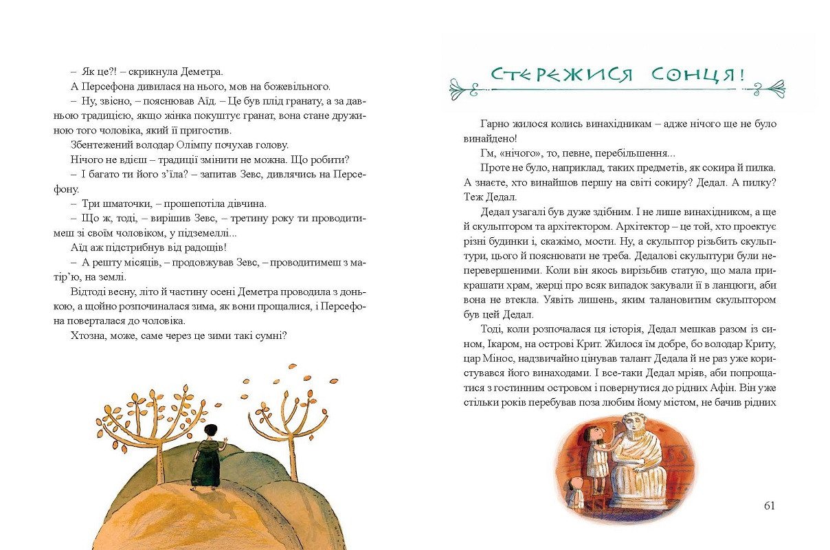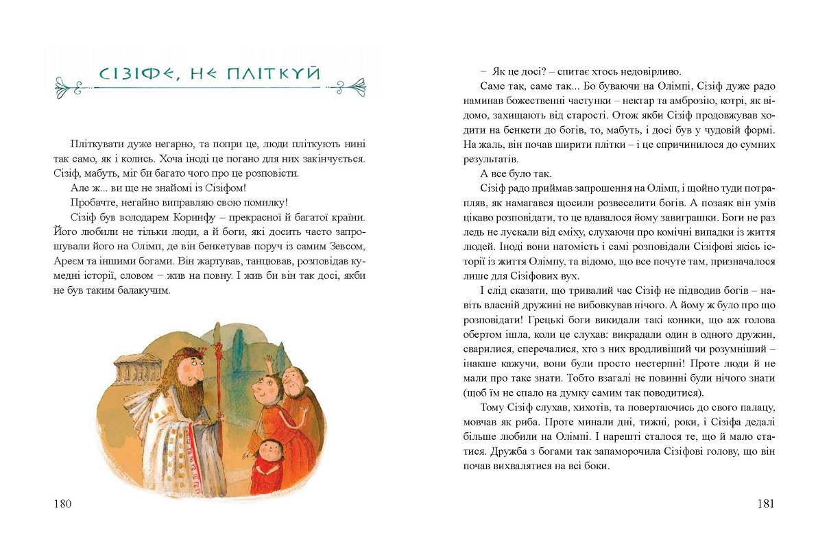 Ґжеґож Касдепці знайомити дітей з Олімпом, горою, де живуть грецькі боги, які без угаву бенкетують та веселяться. А ще – із Грецією звичайних смертних, де живуть люди та міфічні створіння. Робити це автор так забавно і так незвично, що цю книжку із задоволенням будуть читати не лише дітлахи! Міфи навчають і водночас розважають завдяки авторському чуття гумору. Сучасна мова, якою користується Ґжеґож Касдепке, його дотепність та відчуття слова, допоможуть дітям краще пізнати й полюбити античні годинники, пробудити до них справжню цікавість…