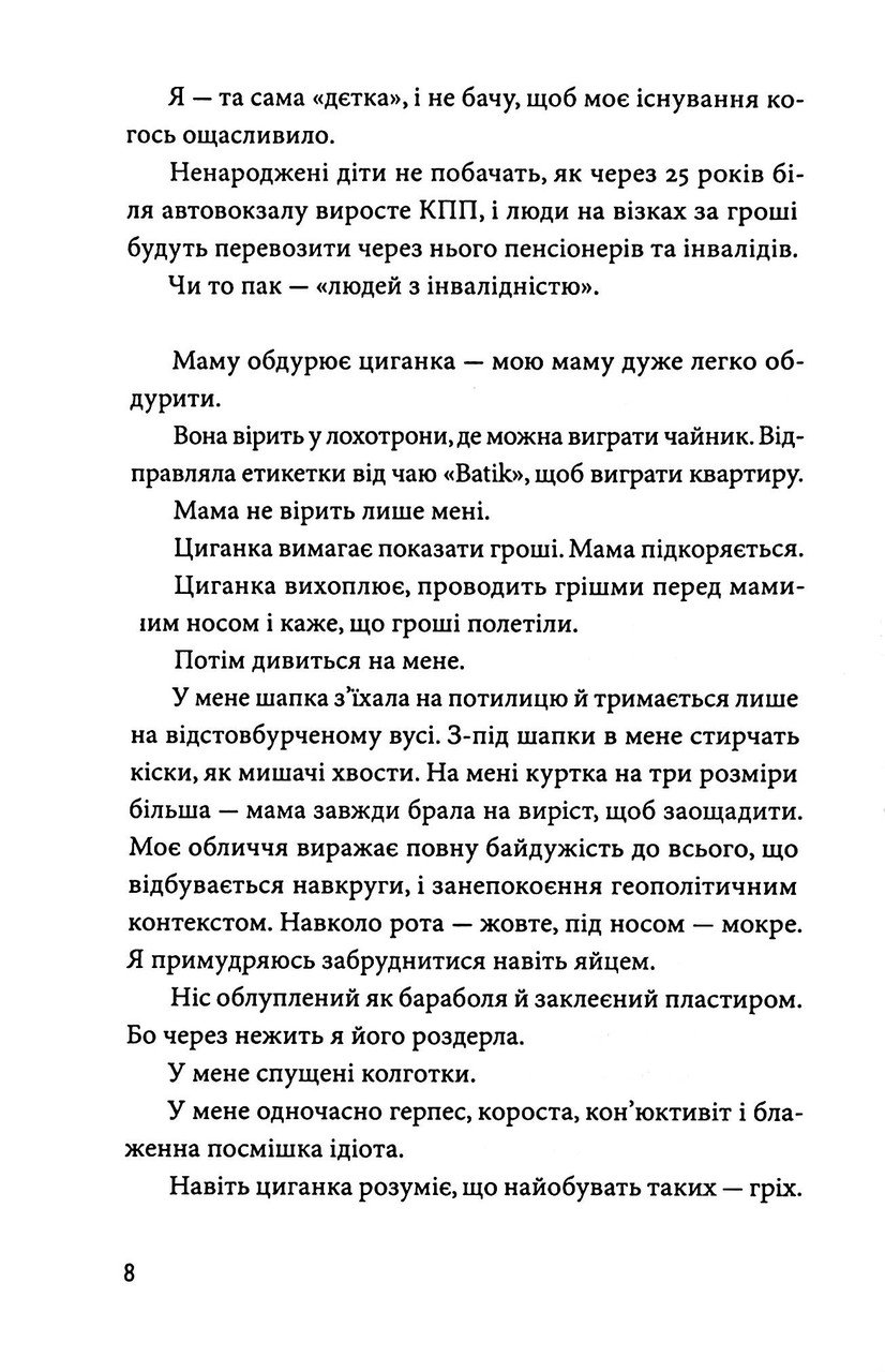 Ласкаво просимо в невеликій смт біля Луганська. Тут година зупинилася десь між «совком» та буремними 90-ми. Це світ, де істину черпають із газети «СНІД-Інфо», а хвороби лікують у «чарівного діда», що викатує яйцем. Тут панують залізобетонні правила: «не жили харашо — не треба й починати», а народження дівчинки — це лише поява нової помічниці. Авторка з нещадною іронією та сарказмом описує життя тих, кому не пощастило народитися «найрозумнішим» у середовищі, де будь-яка іншасть карається громадським осудом. «Мій прапор записавши котик» — це смішний до кільок і водночас страшний до дріжаків зліпок реальності, яка, на жаль, досі існує поруч із нами.