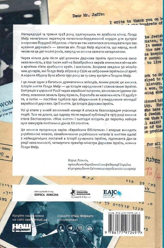 «Моє життя» — автобіографія першої жінки – прем’єр-міністра Ізраїлю Ґолді Меїр. Це відверта книга, яка розкриває особистість та цілі авторки. Практичний ідеалізм Меїр можна побачити у таких проявах її політичних зусиль, як рішуча пропаганда допомоги з безробіття. Робота, яка мене “найбільше хвилювала і цікавила”, – пише вона, – це “проекція основних соціальних принципів у приземлену повсякденність життя”. Хоч основні політичні події та світові гравці, з якими працювала Меїр, добре відомі, у книжці вони розкриваються по-новому — реалістично та емоційно.