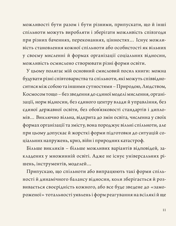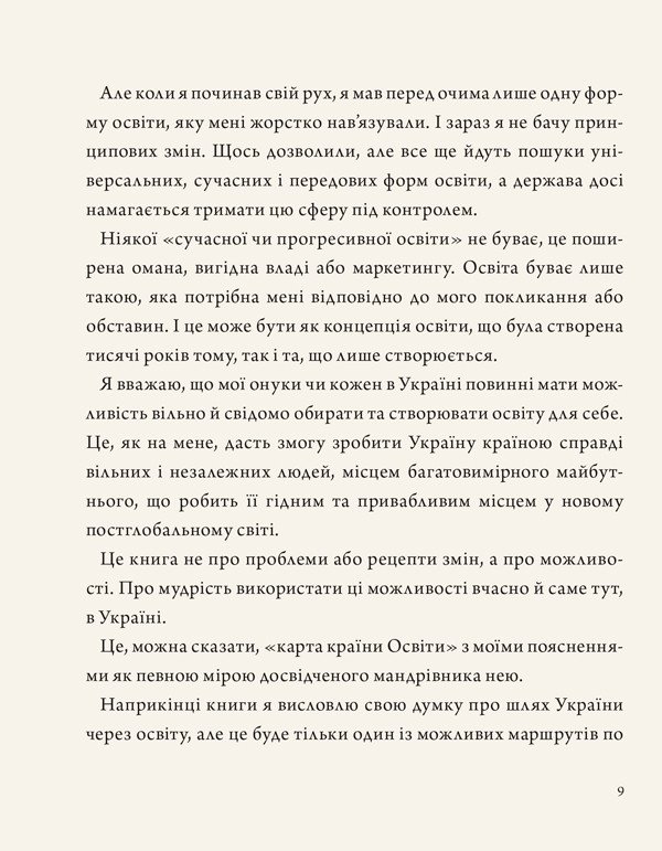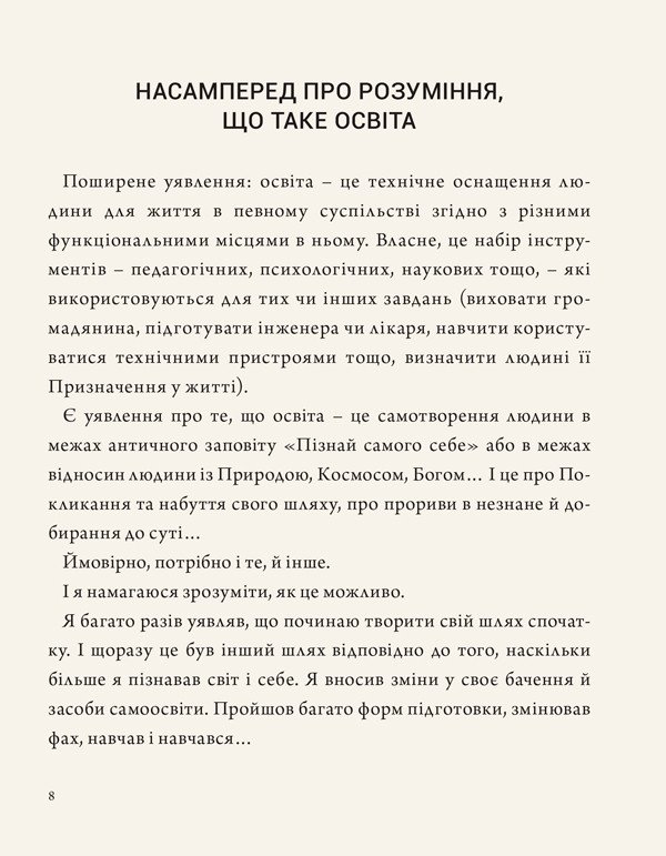 Володимир Нікітін — мислитель, поет, доктор культурології та кандидат архітектури, автор чисельних поетичних та наукових праць, а також понад сотні публікацій про архітектуру, містобудування, культуру та освіту. У цій книжці він зосереджується не на проблемах освіти, а на її можливостях — на тому, як ці можливості можна вчасно побачити, правильно зрозуміти і сміливо використати саме в українських реаліях. Частина його ідей співзвучна певним освітнім традиціям, а інші можуть викликати заперечення — і саме ця багатоголосність створює простір для власного аналізу читача. У книжці є й елементи передбачення: Нікітін осмислює, якою може стати Україна в майбутньому та зможе освіта відіграти ключову роль у формуванні її справжнього суверенитету.