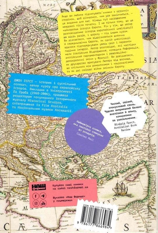 Про що книга «Найкоротша історія Європи» автора Джона Герста Історія цивілізації, яка підпорядкувала собі цілий світ. ТЕМАТИКА КНИГИ Всесвітня історія, Європа, нонфікшен. Якщо ви любите підчитувати книжки з останніх сторінок, щоб дізнатися, чим усе закінчитися, — це видання для вас. Кінець тут наставатиме невдовзі після початку. І не тільки тому, що це найкоротша історія Європи. Річ у тім, що автор розповідатиме історію європейської цивілізації аж шість разів, і щоразу — під іншим кутом. Для широкого кола читачів, усіх, хто хоче дослідити, з чого складається історія європейської цивілізації, як нове народжується зі старого, а минуле вперто відтворюється знову і знову. Чи варто купувати цю книгу? Ви дізнаєтесь, чим відрізняються антична й середньовічна Європа, як одній цивілізації вдалося підпорядкувати весь світ і пережити падіння імперій. Автор розповідає, які наслідки мали італійське Відродження, німецька Реформація, англійський парламентаризм та революційно-демократичні зміни у Франції. Ви дізнаєтеся, як друкарство спасло Лютера від вогнища, що спільного між романтизмом і націоналізмом та як дві світові війни змінили Європу. І все це стисло, ємно та об’єктивно. Щодо останнього не сумнівайтеся: автор цієї книжки — австралієць, тож йому легше позбуватися неупередженого та пам’ятати про лаконічність. ПРО АВТОРА Джон Герст – історик і громадський оглядач, автор курсу про європейську історію. Викладавши в Університеті Ла Троба (1968–2006), працював редактором популярного історичного журналу Historical Studies, співпрацював із Film Australia та Національним музеєм Австралії. КНИЖКИ НА СХОДЖУ ТЕМАТИКУ «Історія світу у 100 предметах» Ніл Макґреґор «Після війни. Чому Римську імперію правильно називати греко-римською Римляни воювали краще за греків і краще за них розробляли закони для управління своєю імперією. Римська інженерна думка також сягнула далі за грецьку, і це згодилося римлянам як для воєн, так і для управління імперією. Однак у всьому іншому вони визнали перевагу за греками і покірно їх наслідували. Типовий представник римської еліти розмовляв як латиною (мова римлян), так і грецькою; він міг відправити сина до академії до Афіни чи найняти грецького раба, щоб той навчав його дітей удома. Отже, називаючи Римську імперію греко-римською, ми чинимо так услід за самими римлянами. Про приватну власність як фактор демократії Середньовічні королі довго боролися за якнайширші владні повноваження: можливість правити незалежно від знати, встановлювати власну систему оподаткування, мати армію під своїм цілковитим контролем і особистий бюрократичний апарат. Проте не все було їм до снаги, оскільки вони стартували з дуже слабких позицій. Скажімо, приватну власність вважали священною та неприкосновеною, а знати привласнила землі, надані їй для управління. Це стримувало королівські потуги. Влада правителів зростала, та все ж вони не перетворилися на східних деспотів, яким у межах їх володінь належало геть усі. Коли деспотові чогось бракувало, він просто експропріював собі власність в інших людей або відправляв воїнів на ринок — набрати потрібний товар. Європейські правителі, навіть наділені «абсолютною» владою, ніколи б так не могли. Не все належить королю. На цьому основному принципі ґрунтувалося європейське розуміння влади. Поняття особис