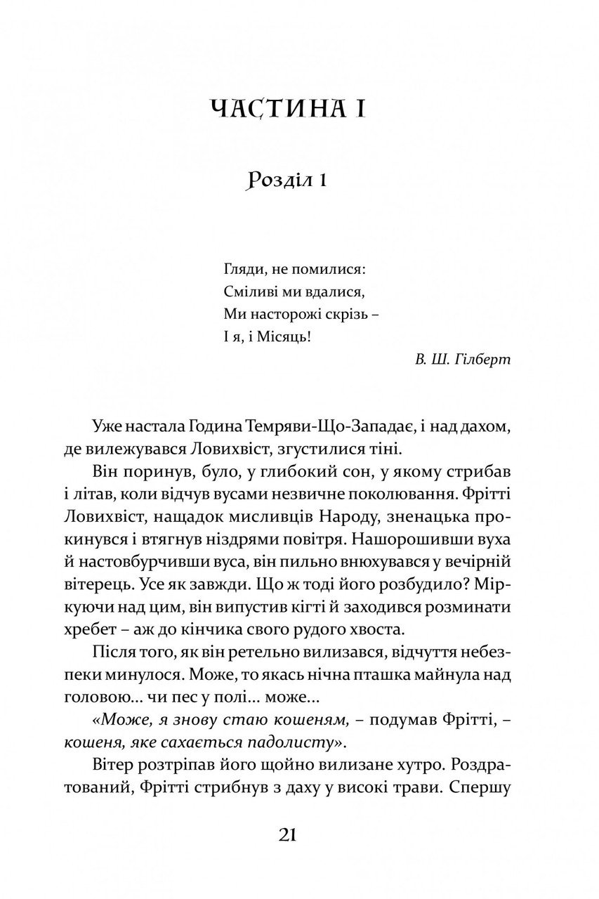 Тінь біди впала на весь котячий рід – таємниче коти стали безслідно зникати. Гнів і страх запанували серед Народу, і хоробрий молодий кіт Фрітті Ловихвіст намагається спонукати свій клан діяти. Та коли і Тихолапка, його срібношерста і довговуса подруга, теж зникає, Фрітті більше не чекатиме на допомогу. Разом із старим сивим дивакуватим котом, що зветься Жучшкірер, і непосидючим кошеням Прудкоплігом, Фрітті покине рідні терени і вирушить на спасіння Тихолапки. Небезпечна казкова місія приведе його із Дому Первородків й Палацу Володарки Котів у підземну цитадель жахіть, які б не приснилися йому в найстрахітливіших котячих снах!