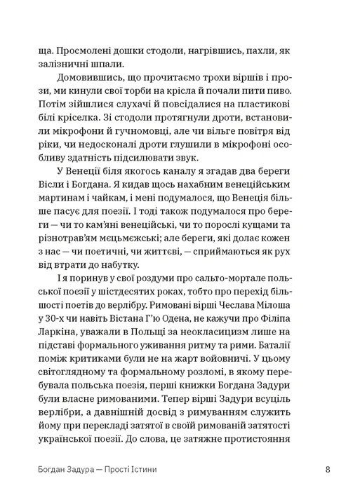 Богдан Задура — визнаний майстер слова, чия поезія поєднує інтелектуальну глибину з іронічною легкістю. Його «Прості істини» перекладені Василем Махном та Ганною Грувер. Цей майстерний переклад забезпечує повне збереження авторської інтонації. Читачі отримують автентичний текст українською мовою, зберігаючи оригінальний баланс комічного та трагічного.