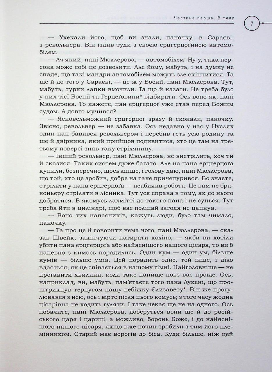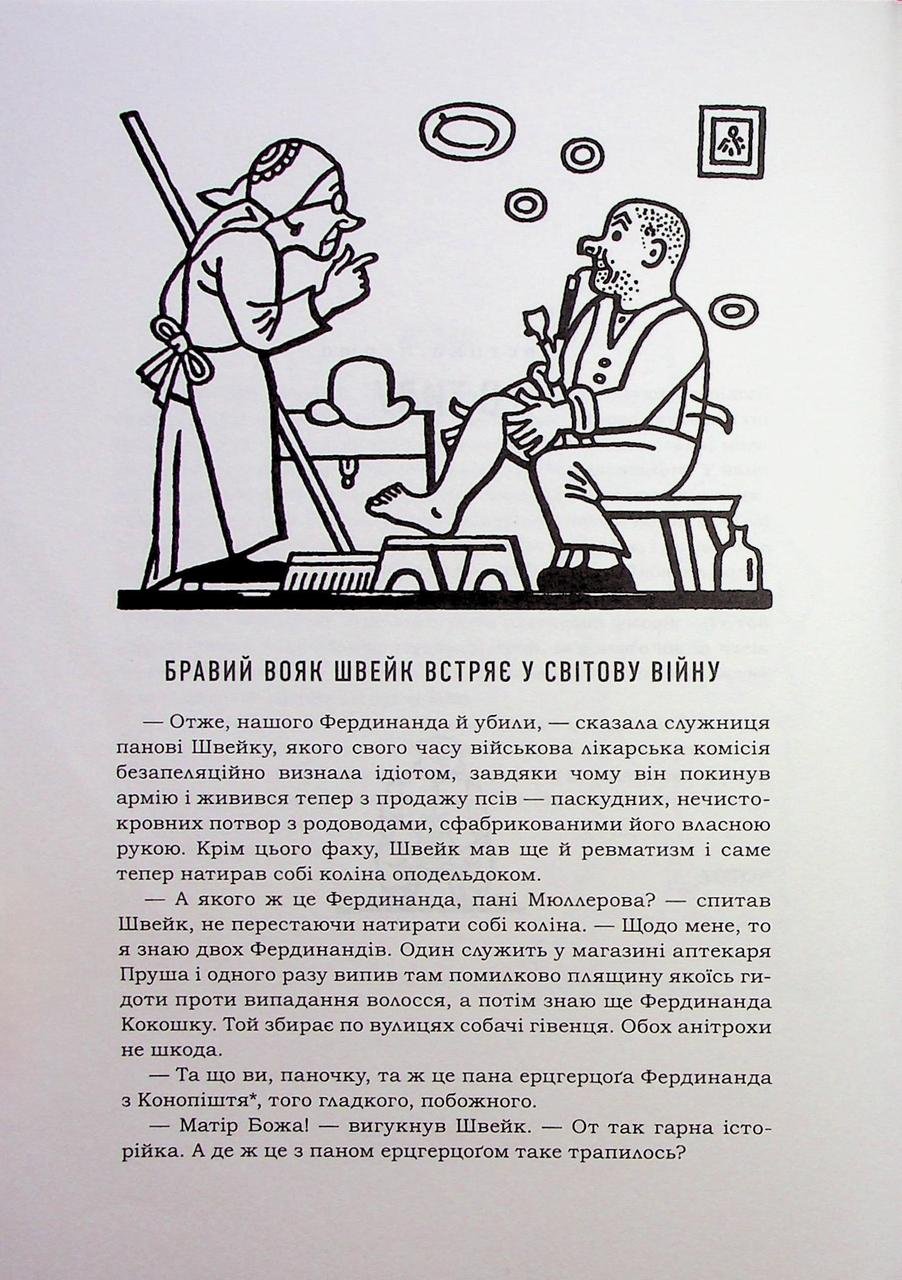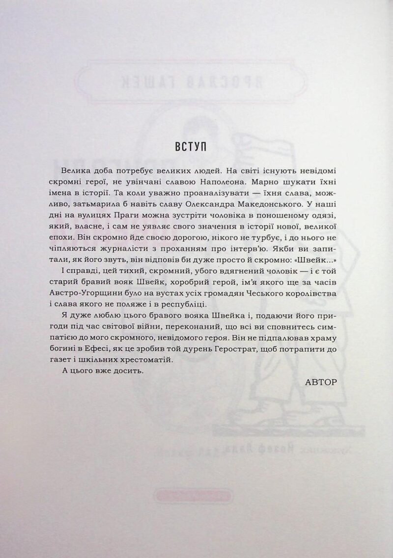 Ох, який бо він і справді бравий вояк, який хвацький оповідач, цей хитрюще-простакуватий, цей дурно-зворушливий Швейк, який (як про це не раз уже писалося і малювалося) разом з іншими літературними титанами, такими, як Гамлет і Дон-Кіхот. Сподіваємося, що наше видання «Швейка» у класичному перекладі Степана Масляка за редакцією Івана Малковича завоює читацьку прихильність і якістю перекладу, і славетними ілюстраціями Гашекового приятеля Йозефа Ладі, і дизайном, і демократичною ціною, і обом — на обкладинці. (З душею лагідною). У післямові і в слові від редактора читачі знайдуть чимало захоплюючих фактів про перебування Гашека/Швейка в Україні.
