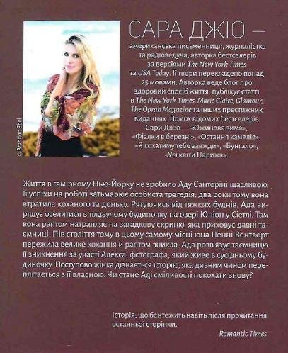 Життя у гамірному Нью-Йорку не зробило Аду Санторіні щасливою. Її успіхи на роботі затьмарює особиста трагедія: два роки тому вона втратила коханого та доньку. Рятуючись від тяжких буднів, Ада вирішує оселитися у плавучому будиночку на озері Юніон біля Сієтлі. Там вона раптом натрапляє на загадкову скриню, яка приховує давні таємниці. Пів століття тому в цьому самому місці юна Пенні Вентворт пережила велику любов і раптом зникла. Ада розв’язує таємницю її зникнення за участі Алекса, фотографа, який живе у сусідньому будиночку. Поступово жінка дізнається історію, яка дивним чином переплітається з її власною. Чи стане Аді сміливості полюбити знову?