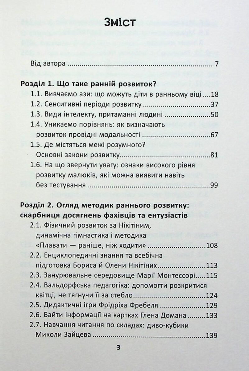 Книжку створено для завзятих батьків, які прагнуть не лише збагатити дитину знаннями чи розвинути в неї певні навички, а якнайповніше розкрити її потенціал та природні таланти, щоб зрештою виховати гармонійну та щасливу особистість. У книжці докладно розглянуто етапи, закономірності та найпопулярніші методики раннього розвитку дітей, а також умови, що сприяють набуттю малюками особистого досвіду, необхідного для всебічного розвитку. Для широкого кола читачів.