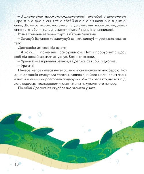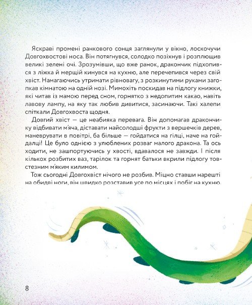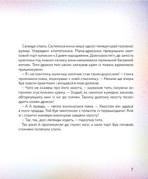 Щороку на Різдво всі мешканці Драконячого селища збираються на головній галявині навколо вогнища, співають колядки, п’ють какао з зефірками та багато сміються. Запалити різдвяний вогонь цього разу випало п’ятирічному Довгохвостові, але за тиждень до свята він зрозумів, що не може дихати пламенем. Щоб пробудити свій вогонь, дракончик наважується на далеку мандрівку, яка подарує йому незабутню пригоду, справжню дружбу і трохи драконячої мудрості. Ця книга для маленьких читачів — ідеальний варіант для оживання зимових святкувань, теплих родинних читань та подарунків.