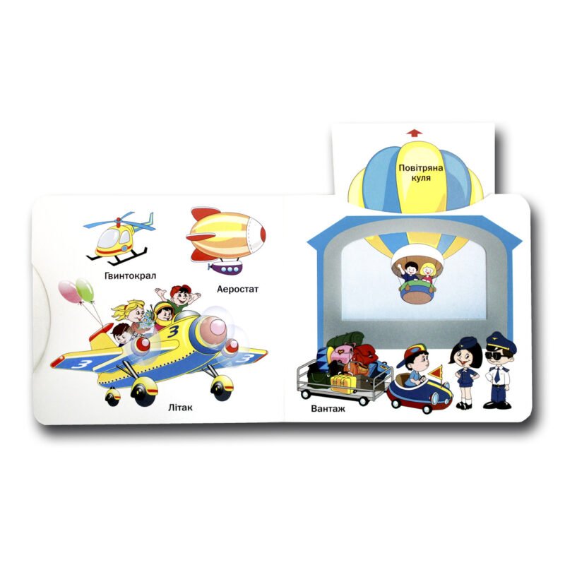 Рухомі картинки Транспорт. Маленькі читачі дуже люблять книжки із рухомими картинками! З радістю тягнути стрілочки на висувних сторінках, крутити вправними пальчиками коліщатка по колу, відчиняють дверцята та гойдають біля різних боків спеціальні відверстия, які чарівним чином змінюють зображення. Рухомі елементи, що оживляють сторінки, захоплюють малюка, дозволяють грати з книжкою. Книга розвиває дрібну моторику, уяву і увагу. Механізми ідеально підходять для маленьких пальчиків.