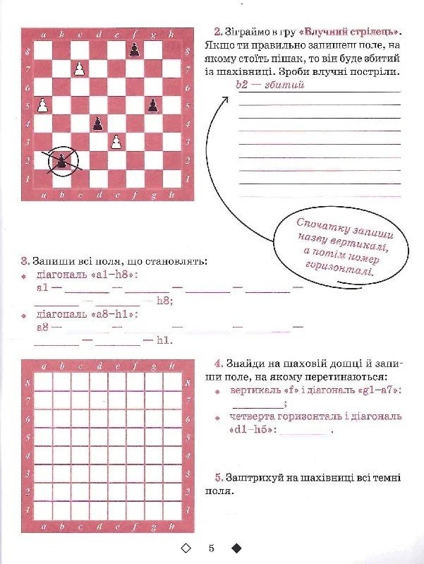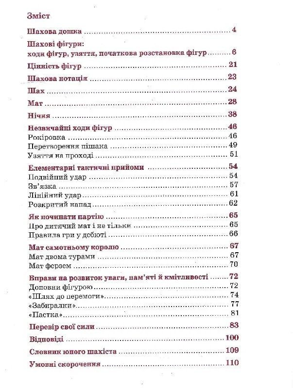 Перед тобою лежить посібник з освоення захопливої гри Шахи. Упродовж багатьох століть у різних країнах люди грають у цю гру. Спочатку вона використовувалася тільки для приємного проведення часу. Але згодом з’ясувалося, що шахи є також справжнім тренажером для розуму: вони розвивають пам’ять, увагу, логічне мислення, кмітливість. Цікавість до гри значно виріс у минулому сторіччі, коли почали проводити матчі на першість світу з шахів. Відтоді в різних країнах світу щорічно проводитиметься велика кількість шахових змагань. На сьогодні твої однолітки в Іспанії, Китаї, Німеччині, США, Турції та інших країнах вивчають гру у школах. За допомогою виконання нескладних управ, викладених у книжці, ти не тільки зможеш опанувати правила цієї стародавньої гри, а й розвинеш свої інтелектуальні здібності. Будь наполегливим, і ти зможеш повести свої війська у бій на шахівниці. Успіхів та побед!