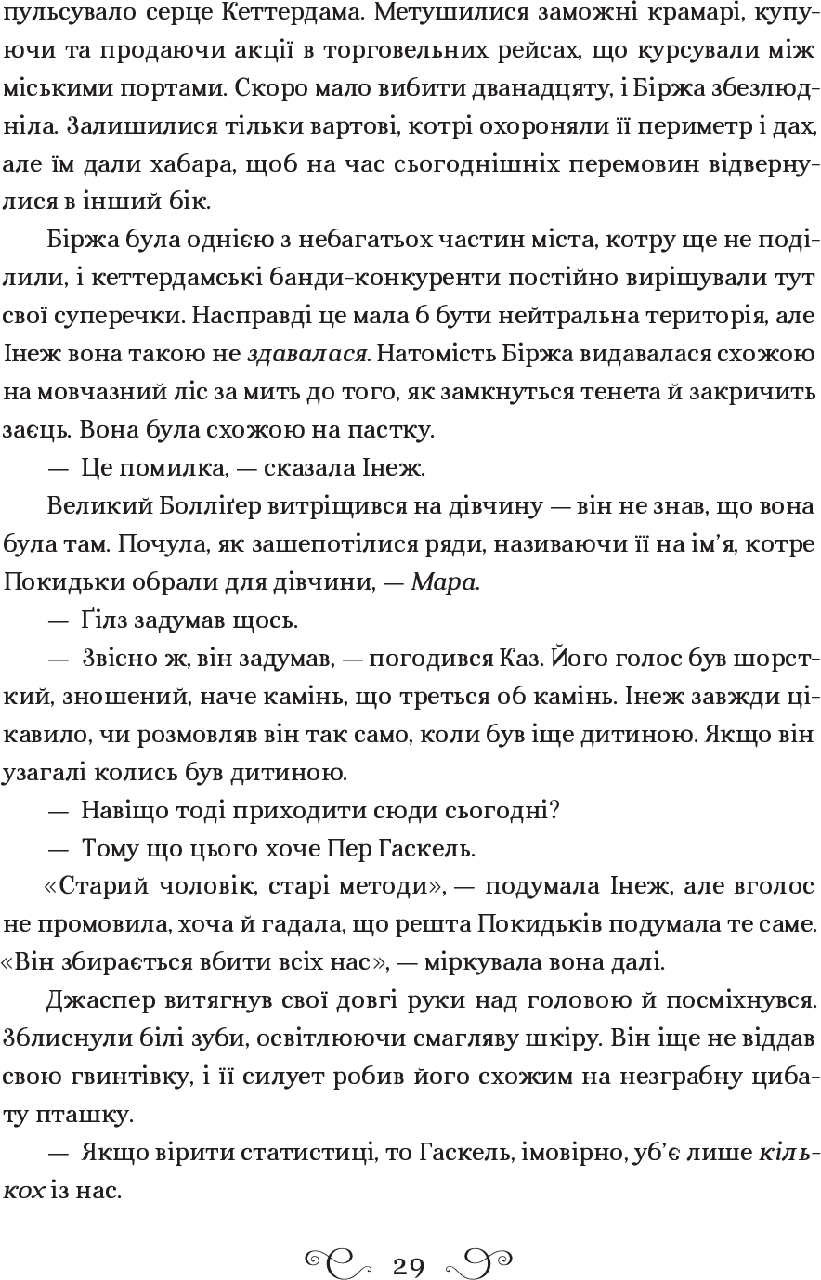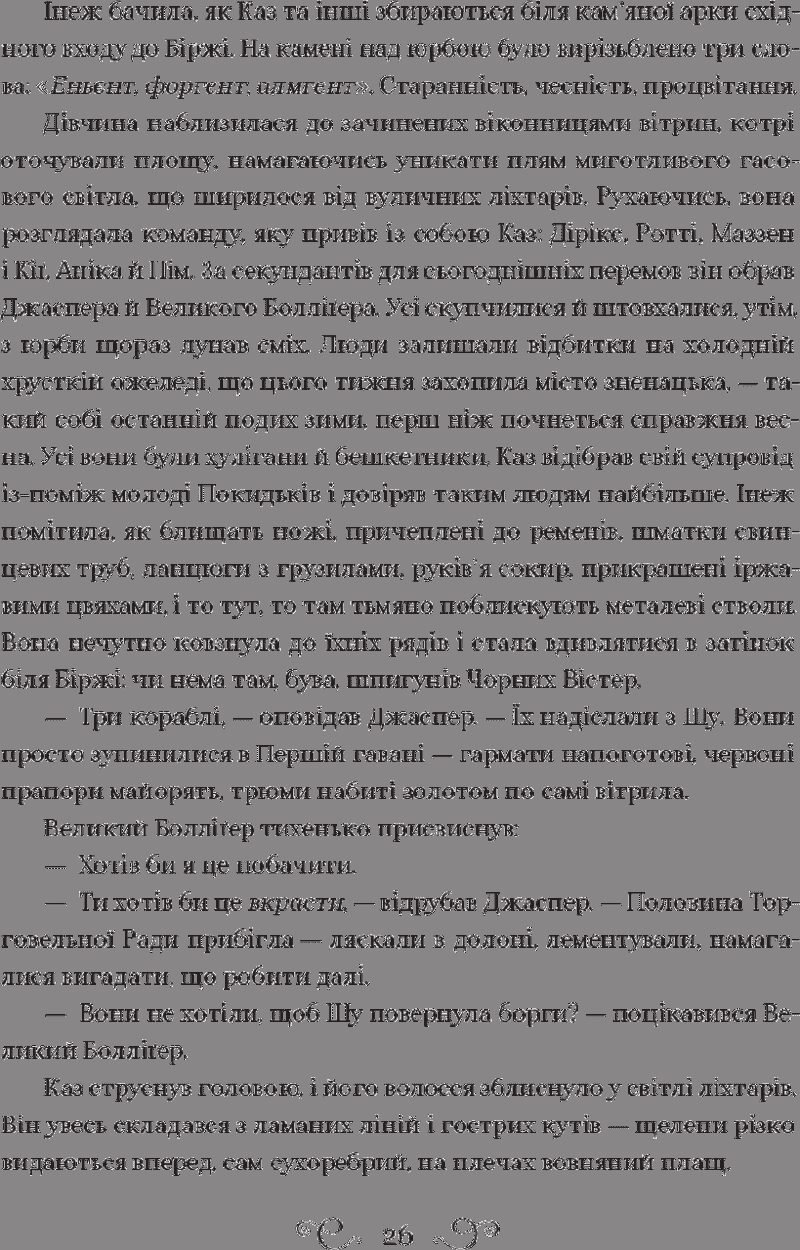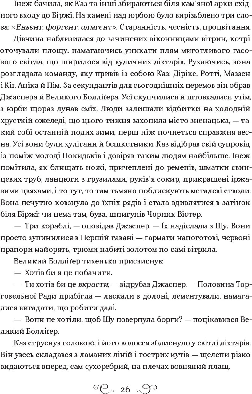 Лі Бардуґо — авторка трилогії про орден Гриша, що стала бестселлером The New York Times. Народилася в Єрусалимі, зростала у Лос-Анджелесі. Закінчила Єльський університет. Займалася рекламою, журналістикою, візажем та спецефектами. Нині живе й пише у Голлівуді, де іноді можна почути виступи її гурту. Кримінальному генію Казу Бреккеру пропонують узятися за смертельно небезпечне викрадення й стати багатшим, ніж у найсміливіших мечтах. Але він не впорається самотужки… Жертва, що спіткала до помсти Стрілець, що не відмовиться від парі Дрюскеле, мисливця за відьмами Шпигунка, знана як Мара Серцетлумачниця, яка вижила в дебрях завдяки власним чарам Крамарик, що розуміється на вибухівці Казова команда — єдине. Якщо вони не повбивають одне одного дорогою до мети.